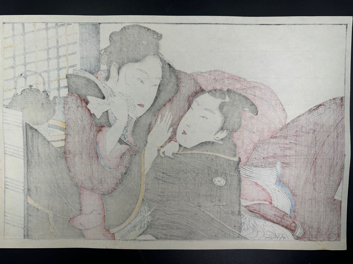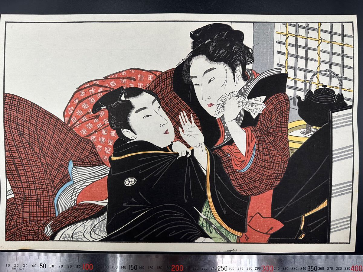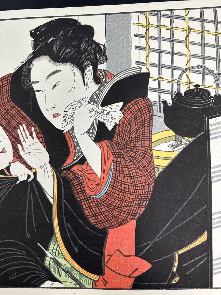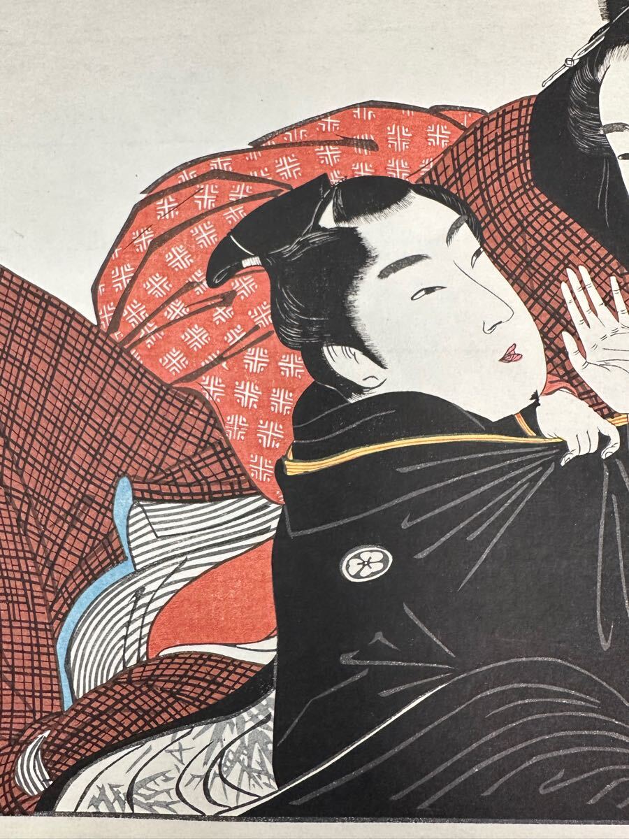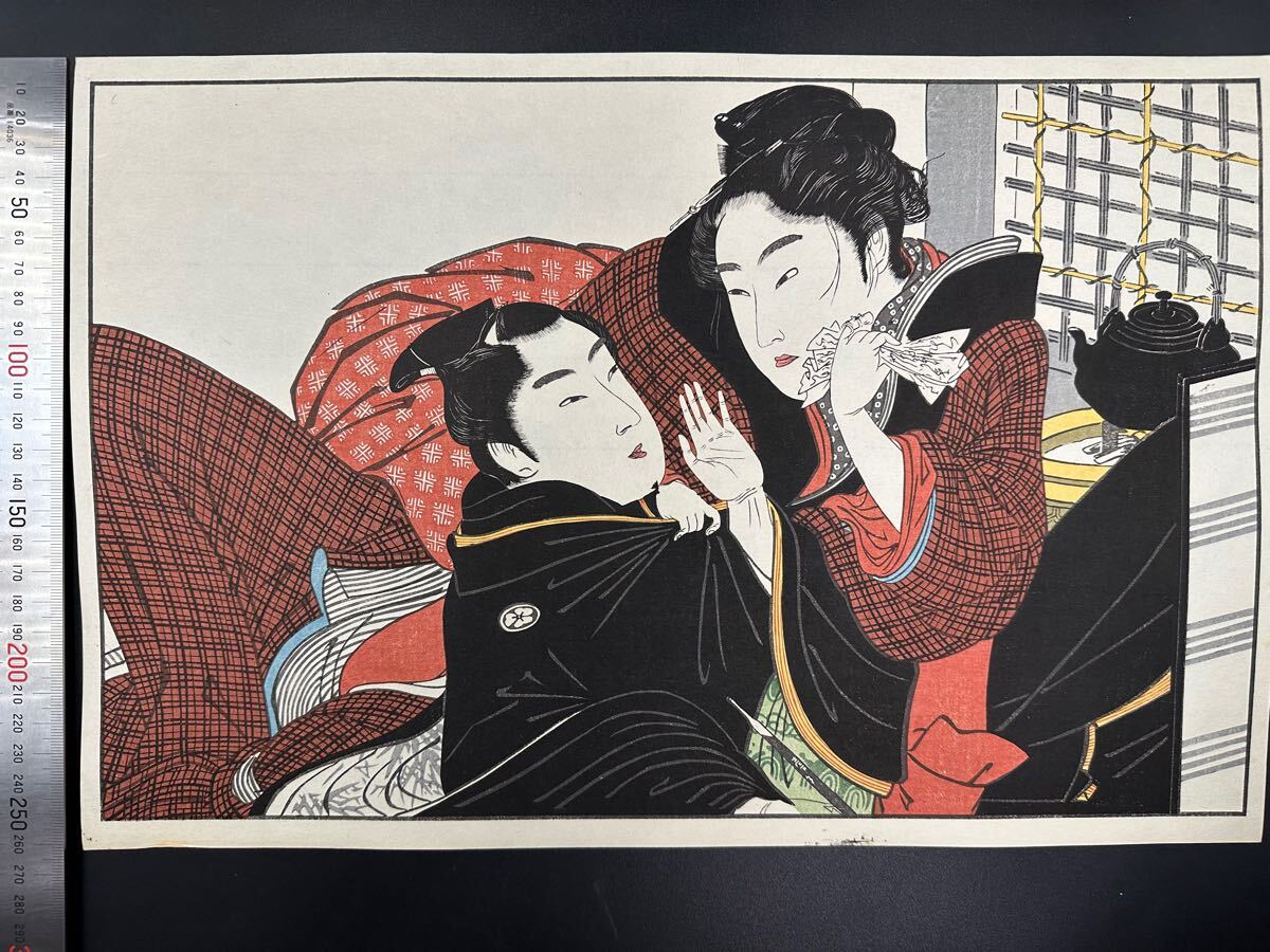 【真作】大正期 浮世絵木版画 喜多川歌麿「歌まくら」美人画 大判 錦絵 保存良い