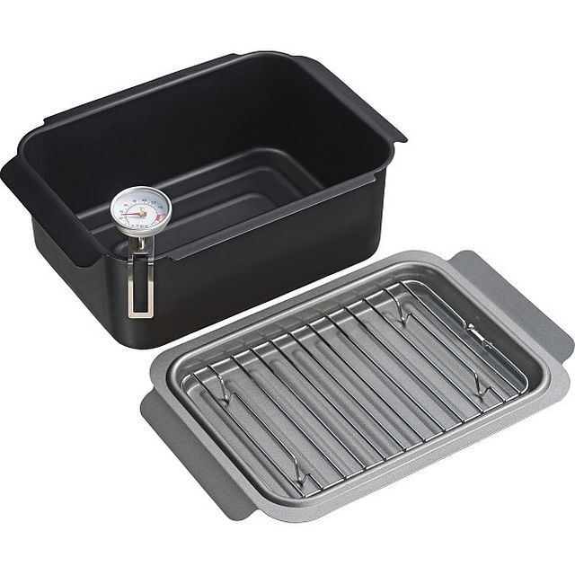 角型だからしっかり揚げ物調理ができるのに収納はすっきり。温度計付きで調理もしやすく、アミ付きの蓋でバットの収納場所にも困りません。長方形なのでコンパクトながらも長さのある食材にも対応します。