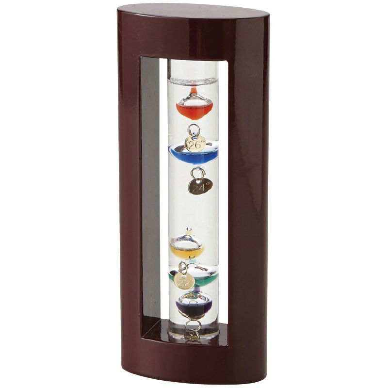 気温によって上下するガラスの球体が気温を示します。測定範囲18℃~26℃。艶のある木枠がモダンで華やかな印象のインテリア温度計です。