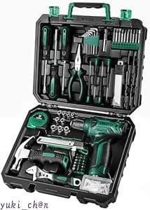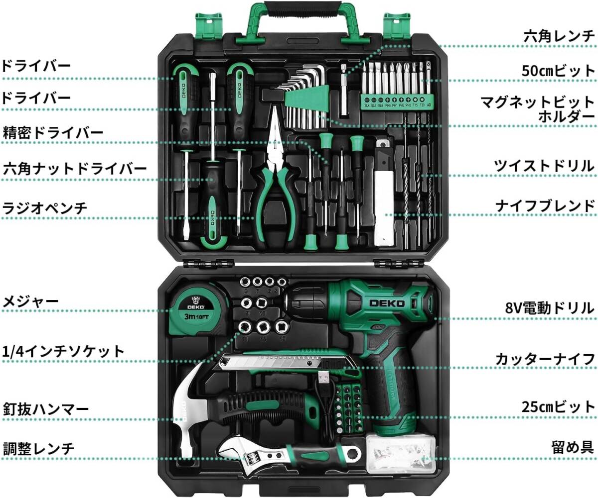 工具セット 8V電動ドリル付き グリーン 126点組 ホームツールセット 家庭用 ツールセット 日曜大工 DIY 修理道具 便利な収納ケース付き