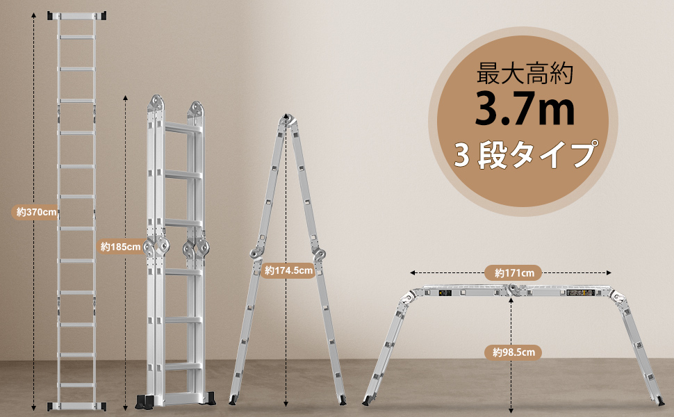 伸縮はしご アルミニウム延長はしご 家庭 オフィス、ロフト屋内および屋外用の折りたたみ式多機能はしご 軽量 (3.7M, 多機能)