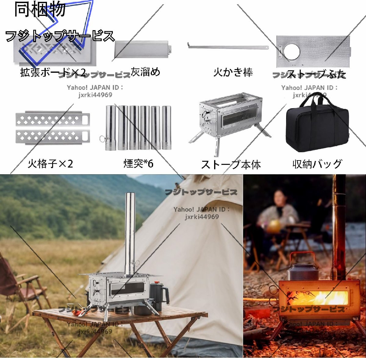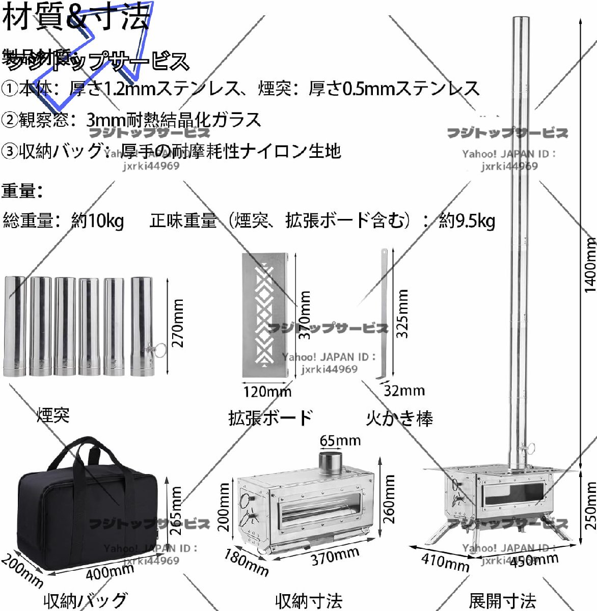 材質:薪ストーブ/ステンレス製、煙突・グリル網/ステンレス、灰かき棒/木+ステンレス、耐熱ガラス