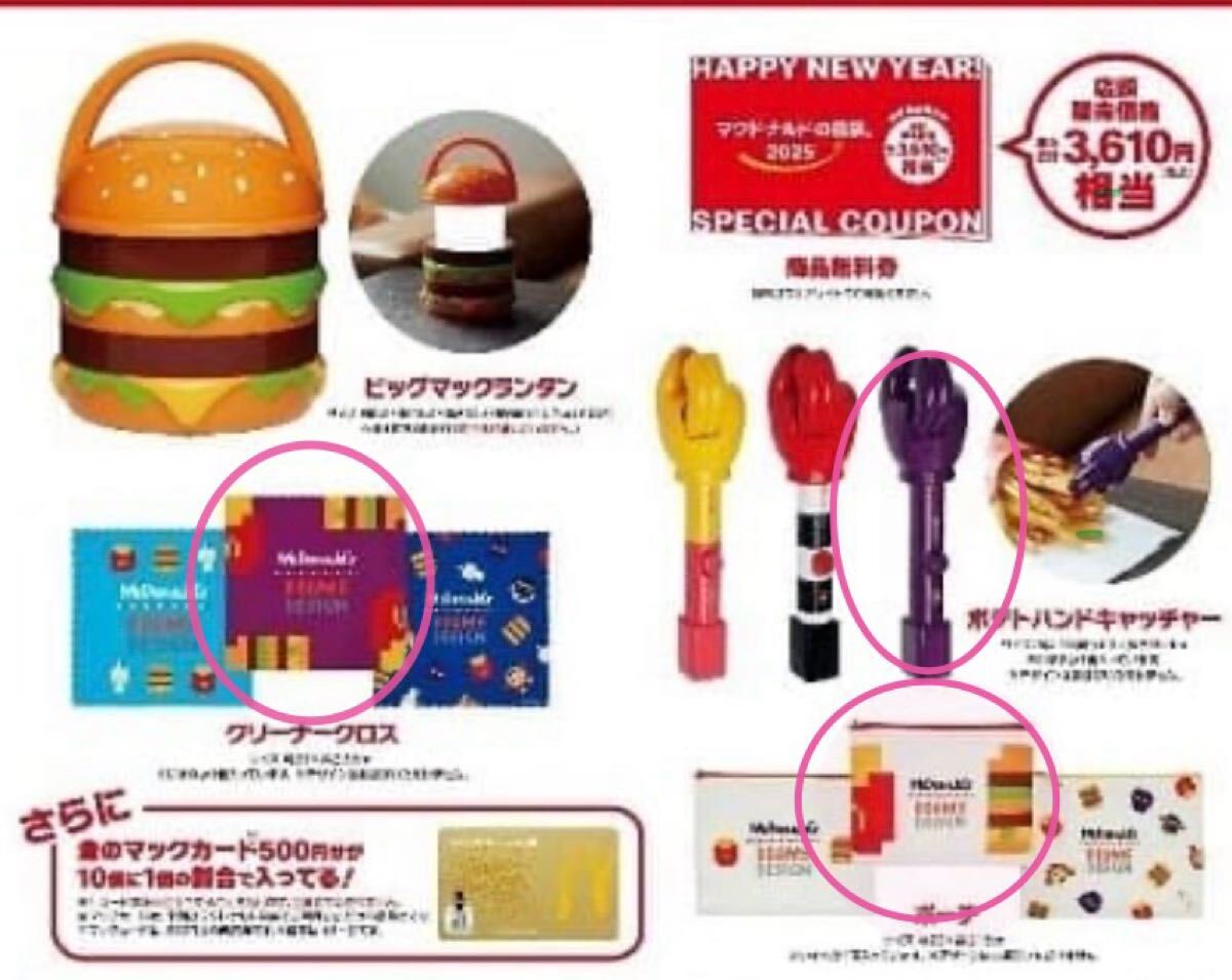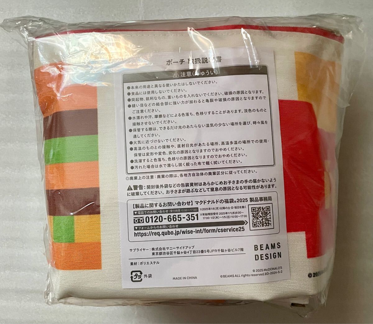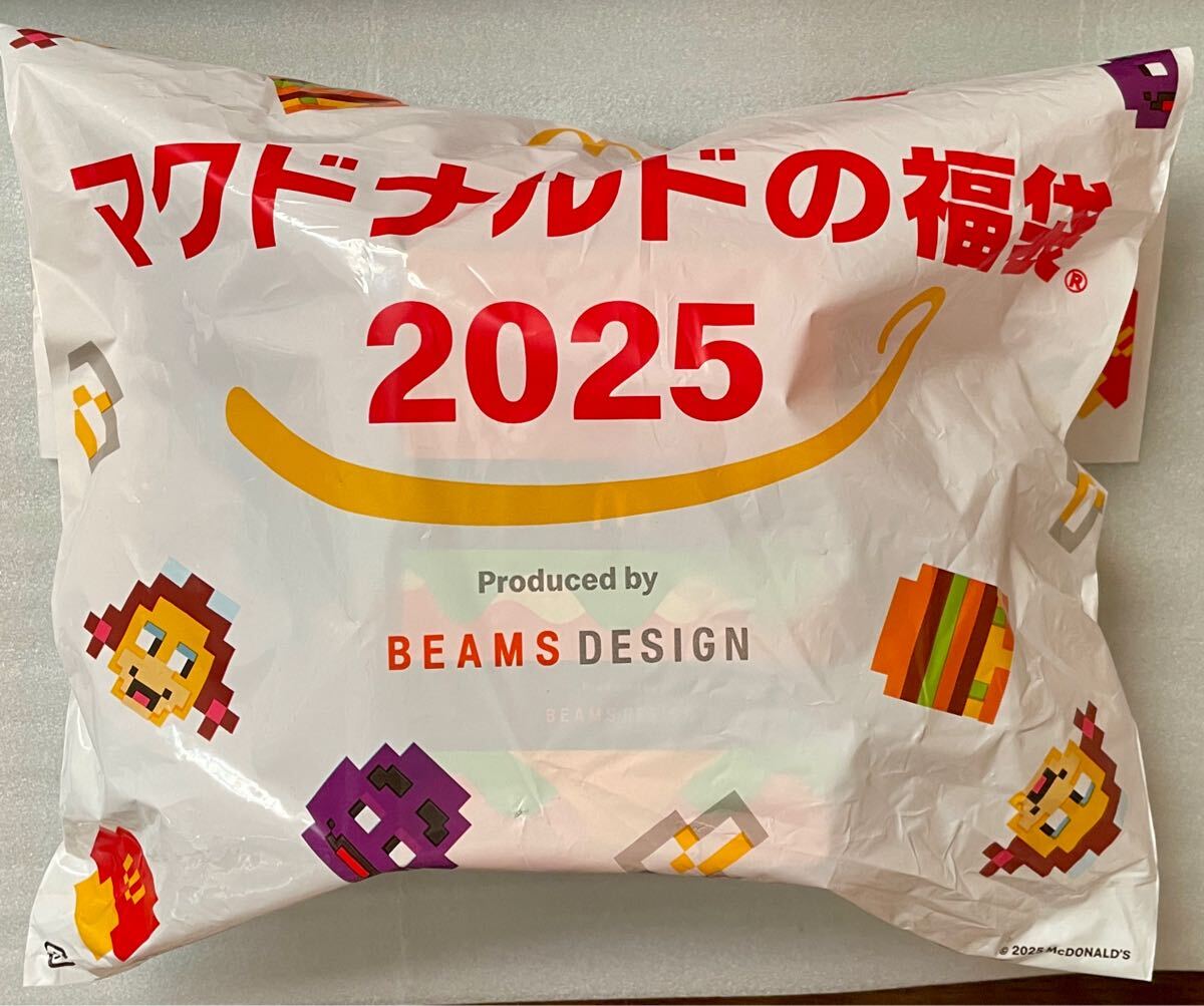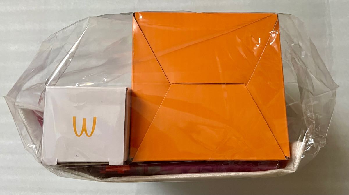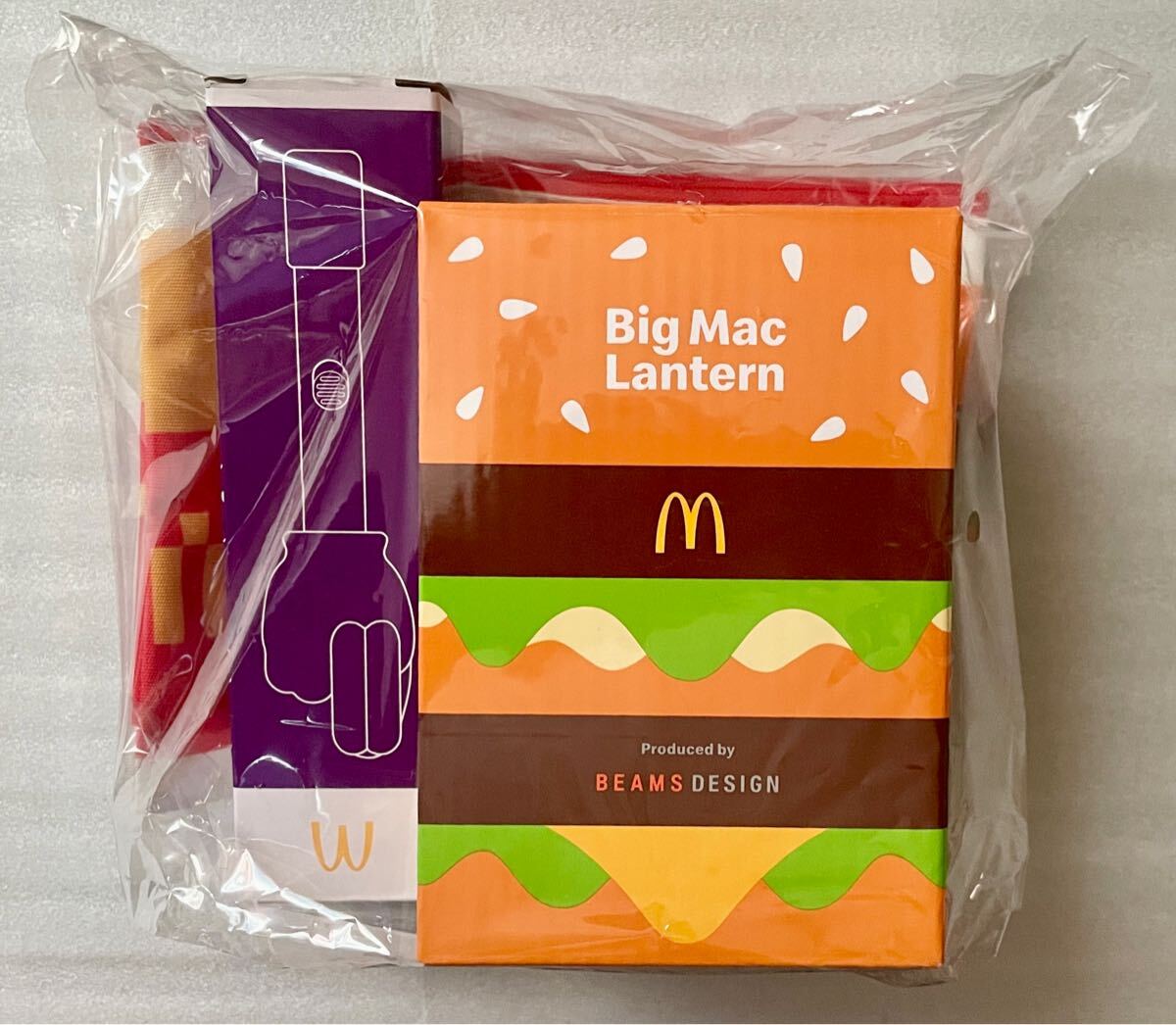 マクドナルドの福袋2025です。BEAMS DESIGN監修のもとデザインされた『ビッグマックランタン』・『クリーナークロス』紫色・『ポテトハンドキャッチャー』紫色・『ポーチ』の4点です。商品無料券は付いておりません。