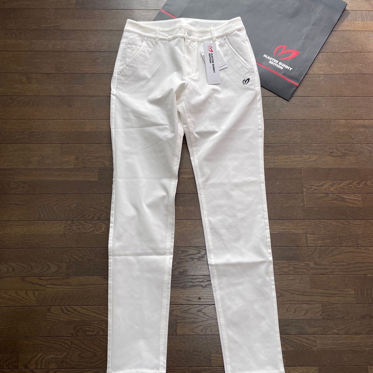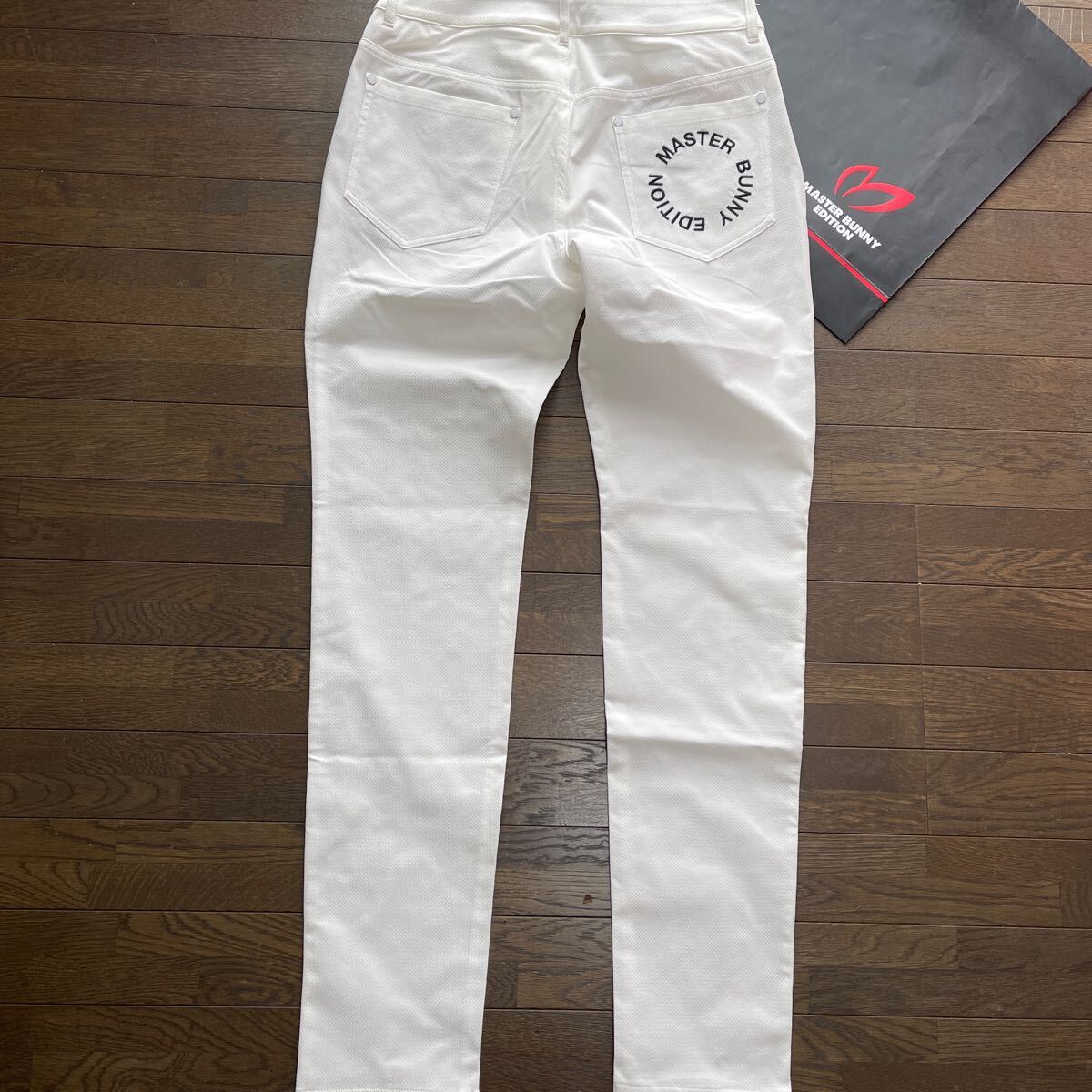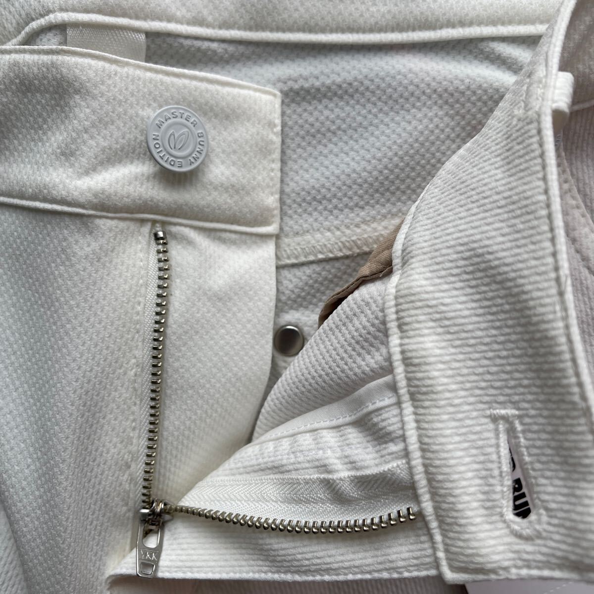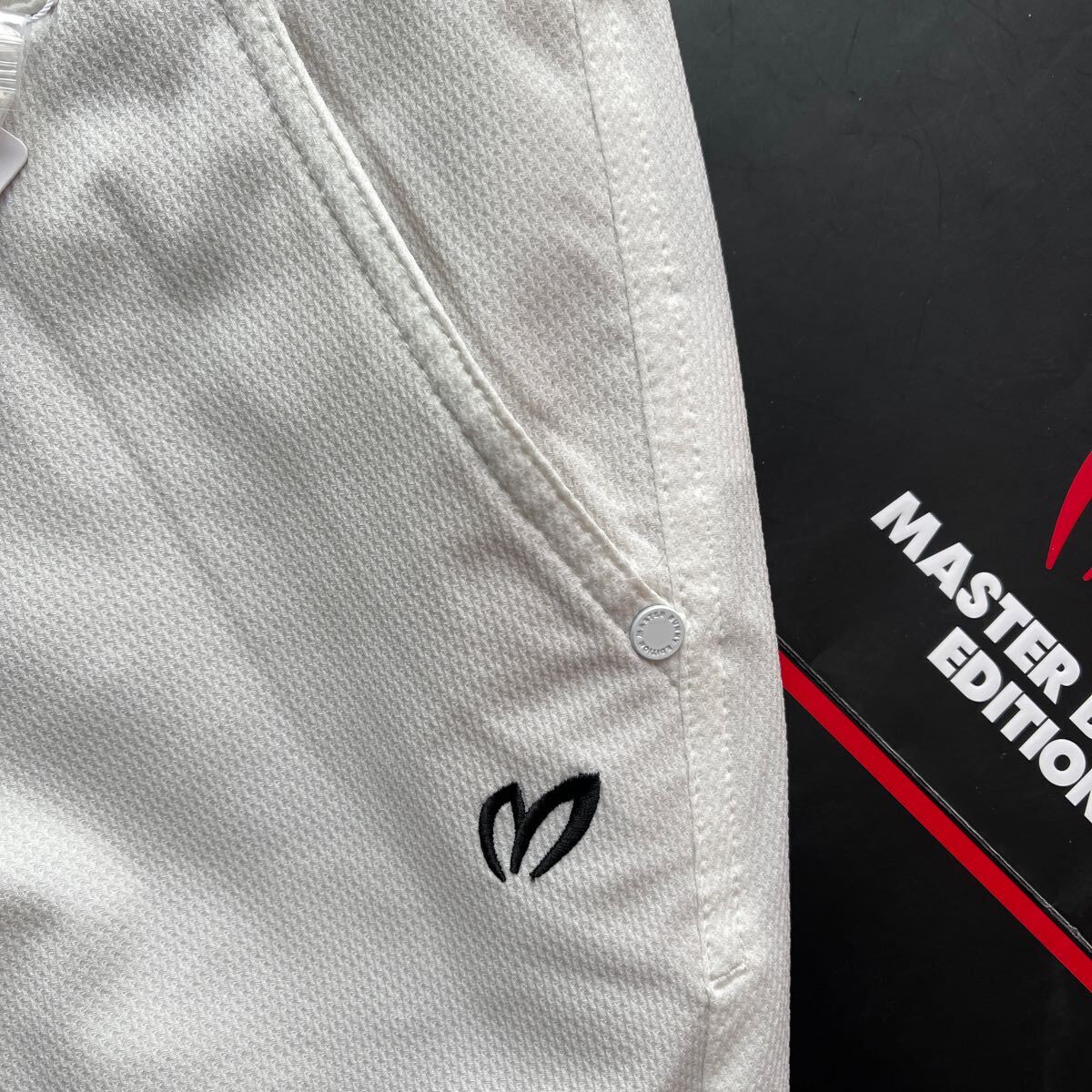 サイズ(2)ウエスト63-66cm/ヒップ91-95cm(メーカー参照)平置き採寸:ウエスト38cm/股上24.5cm/股下80cm/ワタリ幅28cm/裾幅15cm/素材ポリエステル製/ドビー織柄伸縮性ストレッチ素材加工/速乾性軽量ライトウエイトやや薄手蒸れ軽減加工/開閉部:MBEサークルロゴメタリックボタン+ジッパー/ベルトループ付/MBEサークルロゴメタリック留め具ポケット×5/カラーホワイト×MASTER BUNNY EDITIONサークルロゴ+Mマーク刺繍加工/内側最新TSI識別タグ付/直営店希少完売入手困難サイズ大特価商品(定価26,400円税込)宜しくお願い致します。写真撮影での色合いが遮光率により実際の色と異なる場合が有ります。予めご了承願います(((価値観の相違など回避の為マスターバニーPGシリーズ商品に不慣れな方や色合いが特に気になる方はご遠慮下さい)))最終お取引受取連絡完了可能な方でのご落札をお願い致します。