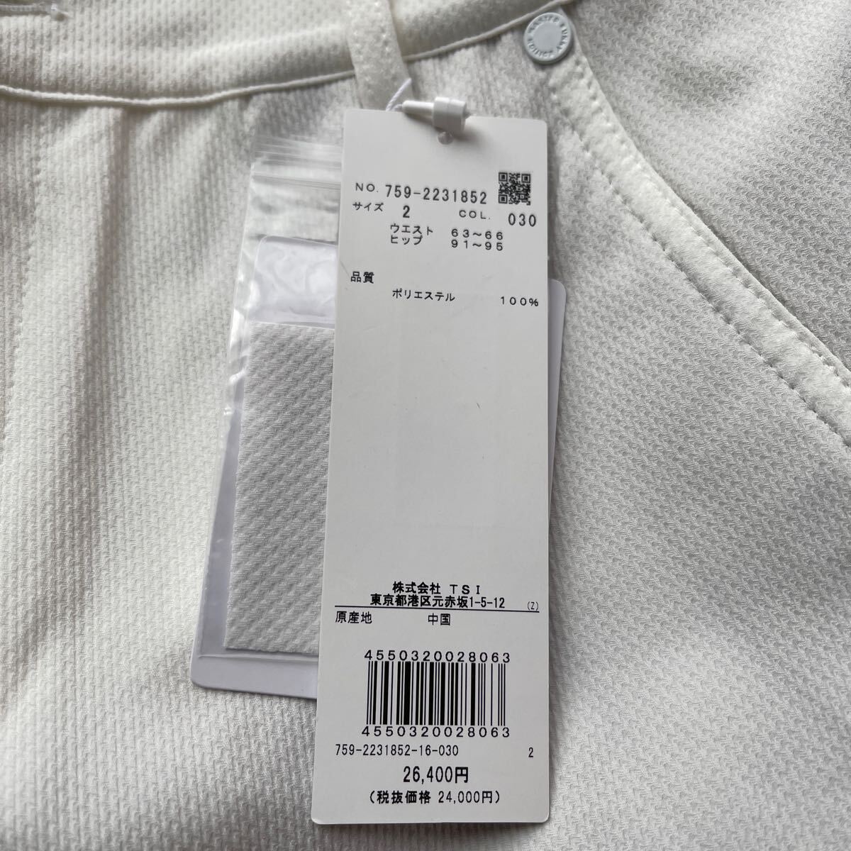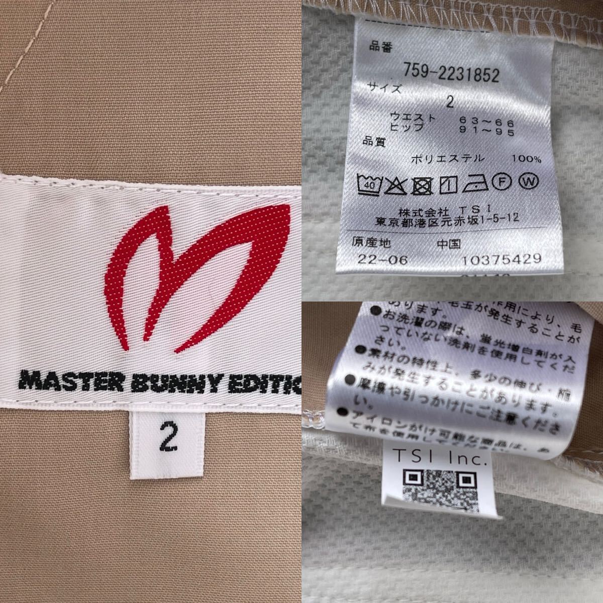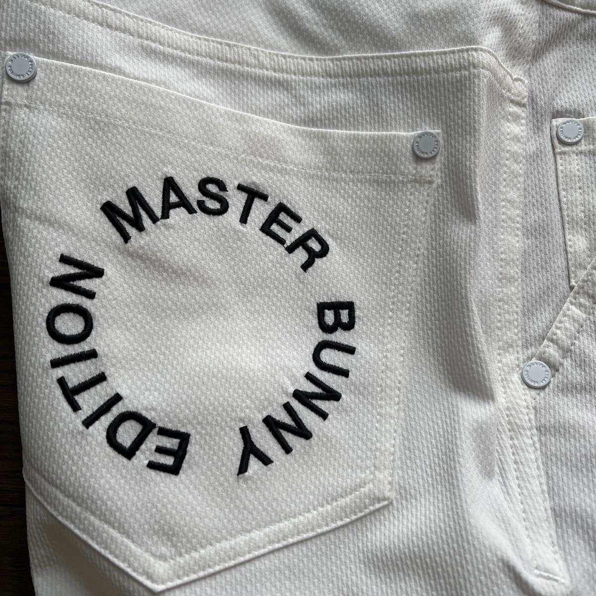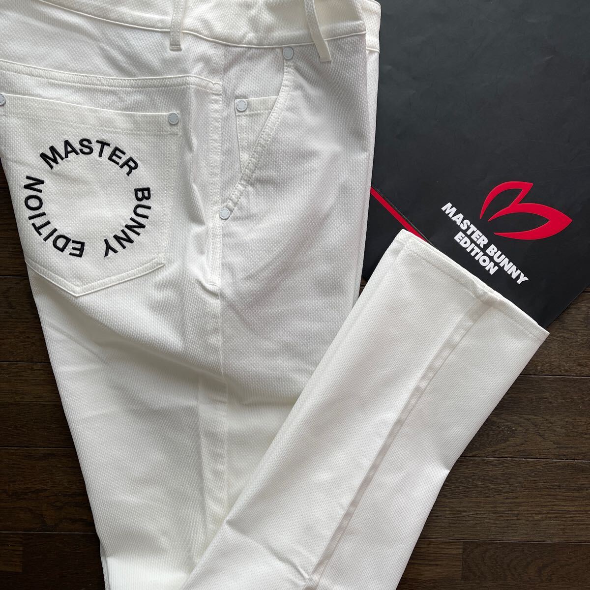 サイズ(2)ウエスト63-66cm/ヒップ91-95cm(メーカー参照)平置き採寸:ウエスト38cm/股上24.5cm/股下80cm/ワタリ幅28cm/裾幅15cm/素材ポリエステル製/ドビー織柄伸縮性ストレッチ素材加工/速乾性軽量ライトウエイトやや薄手蒸れ軽減加工/開閉部:MBEサークルロゴメタリックボタン+ジッパー/ベルトループ付/MBEサークルロゴメタリック留め具ポケット×5/カラーホワイト×MASTER BUNNY EDITIONサークルロゴ+Mマーク刺繍加工/内側最新TSI識別タグ付/直営店希少完売入手困難サイズ大特価商品(定価26,400円税込)宜しくお願い致します。写真撮影での色合いが遮光率により実際の色と異なる場合が有ります。予めご了承願います(((価値観の相違など回避の為マスターバニーPGシリーズ商品に不慣れな方や色合いが特に気になる方はご遠慮下さい)))最終お取引受取連絡完了可能な方でのご落札をお願い致します。