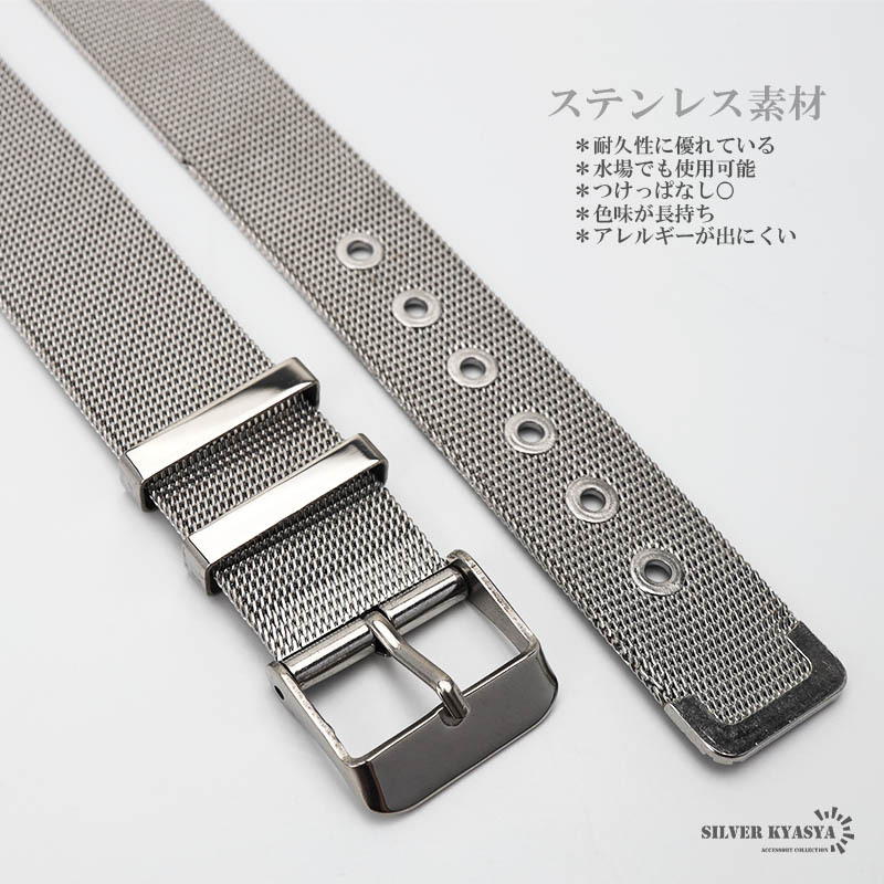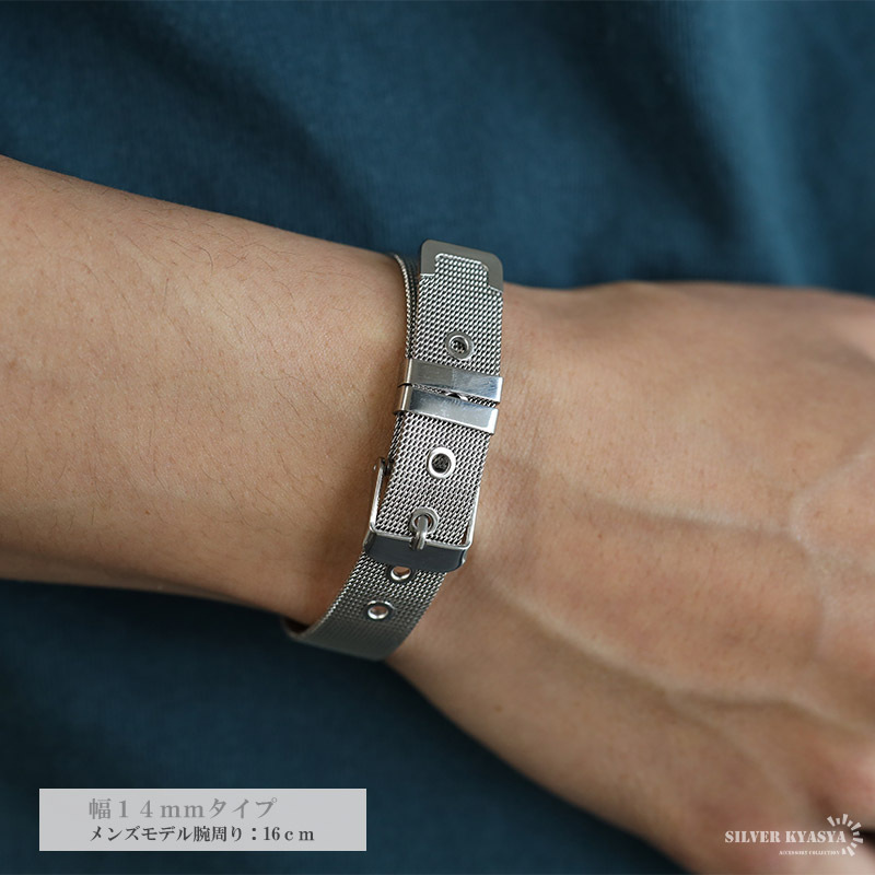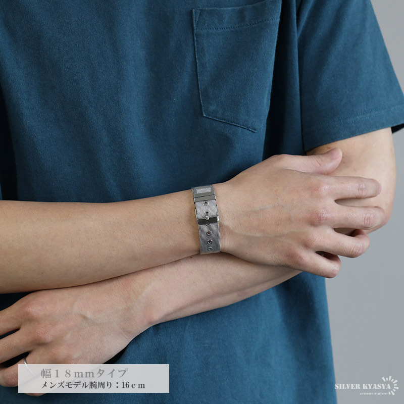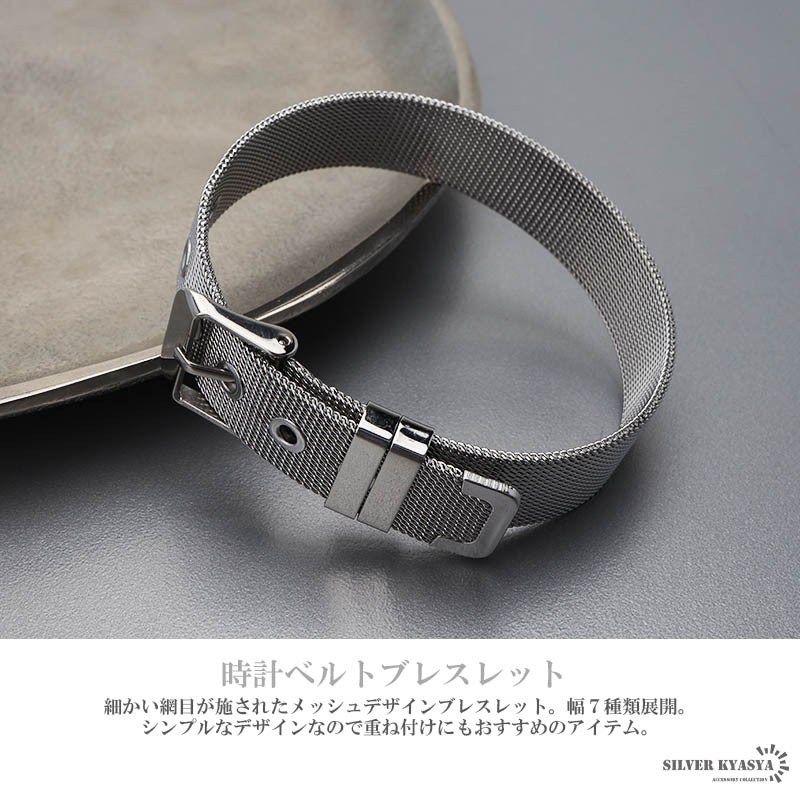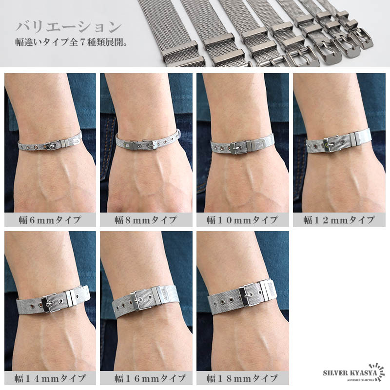 商品概要 | ■時計ベルトブレスレット 細かい網目が施されたメッシュデザインブレスレット。幅7種類展開。シンプルなデザインなので重ね付けにもおすすめのアイテム。 ■ステンレス素材を使用 金属部分は頑丈なことで知られるステンレス素材を採用。耐久性はもちろん耐水性も高く水場での着用も可能。金属アレルギーも出にくいとされている金属です。 |