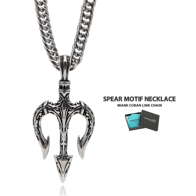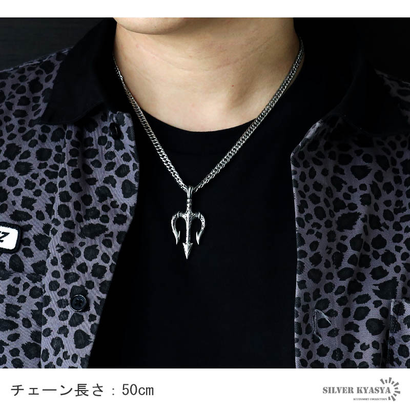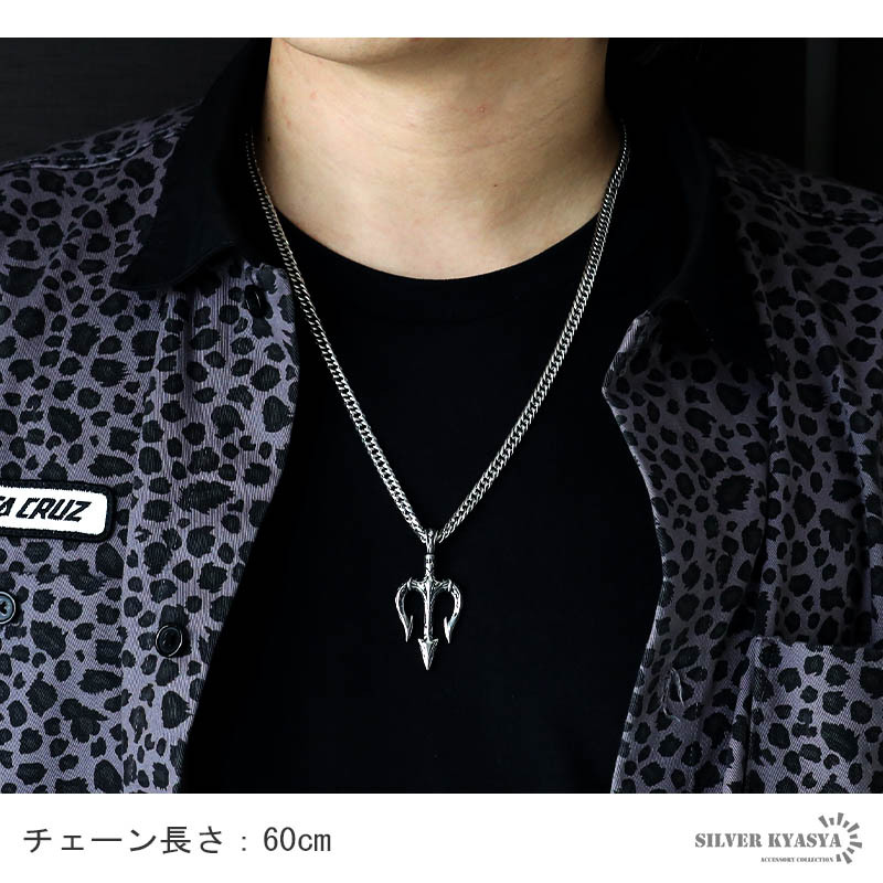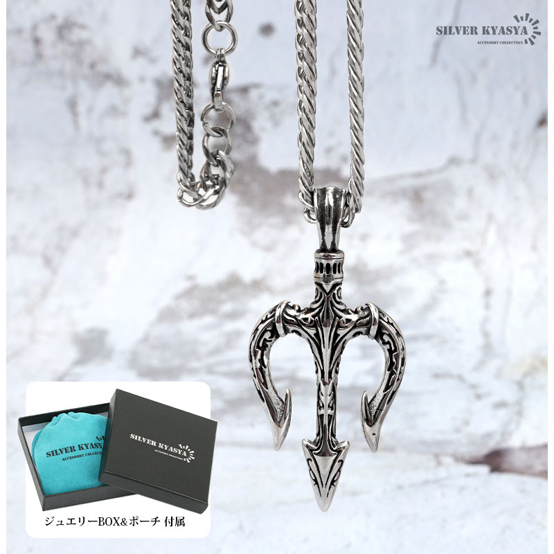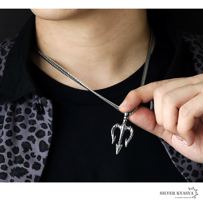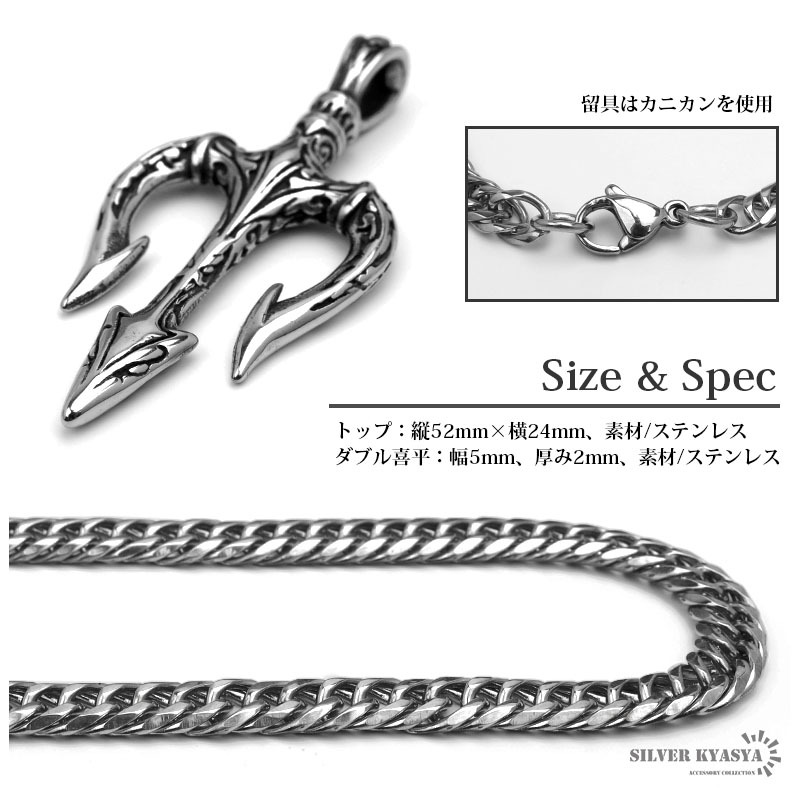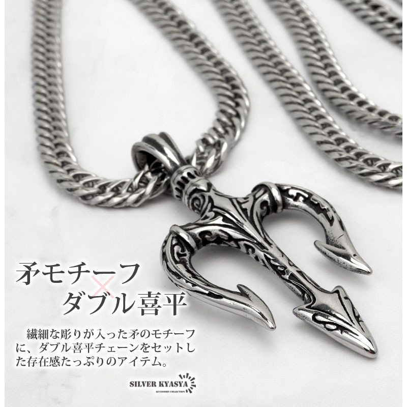 トライデントモチーフのトップと、丁寧に6面カットされたダブル喜平チェーンを使用したネックレス。密度の高いチェーンとネイティブな雰囲気のトップが目を引くアイテム。