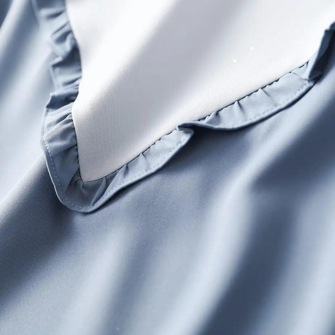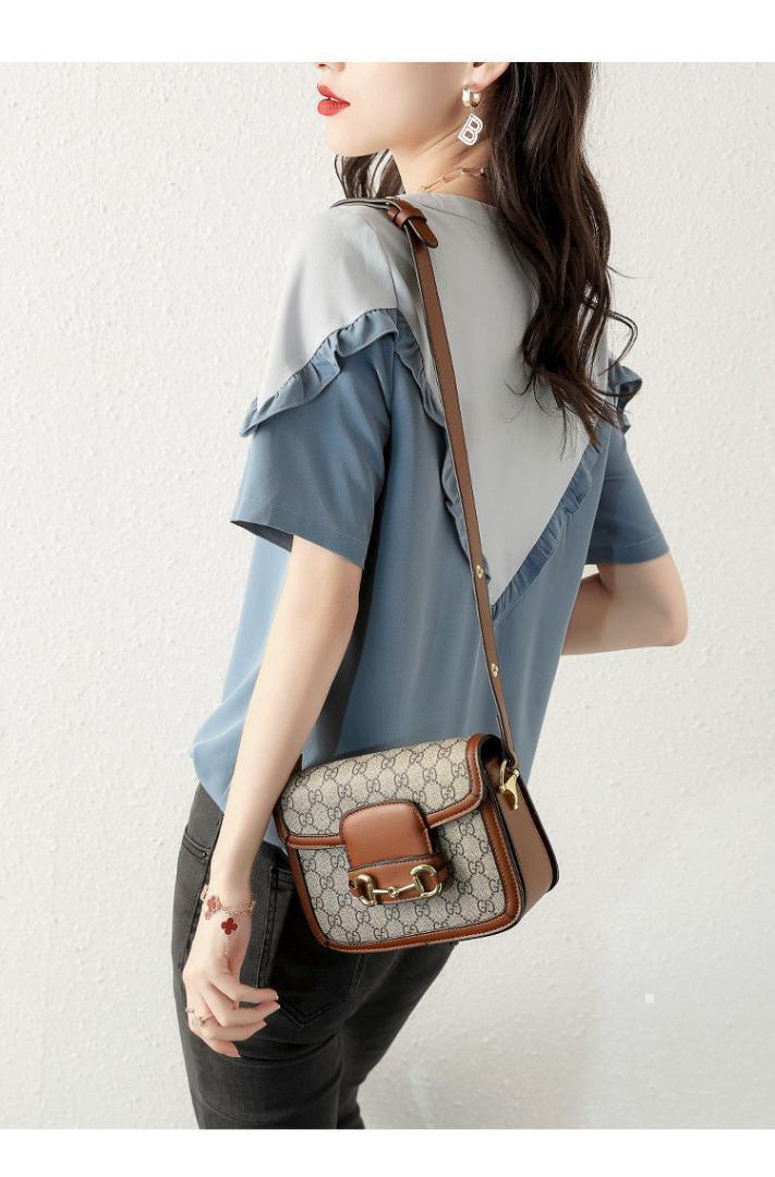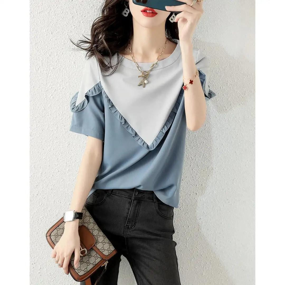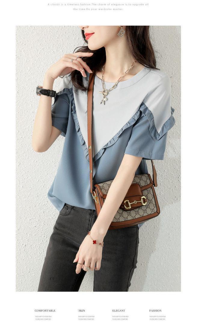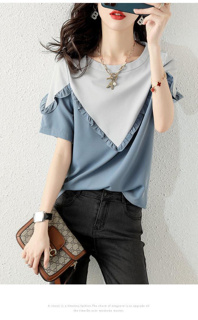レディースブラウス 半袖 かわいい 個性 オフィス カジュアルグレー&ダークブルーのツートンカラー 韓国 夏