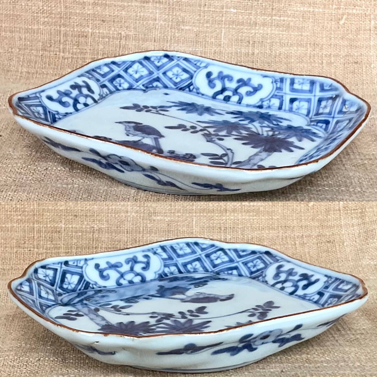 (翔)古伊万里 染付 初期伊万里 前期藍九谷 江戸前期 寛文期 鳥 竹 隅入 紅縁 平向付 五寸皿 ② 1640-1650年代前後