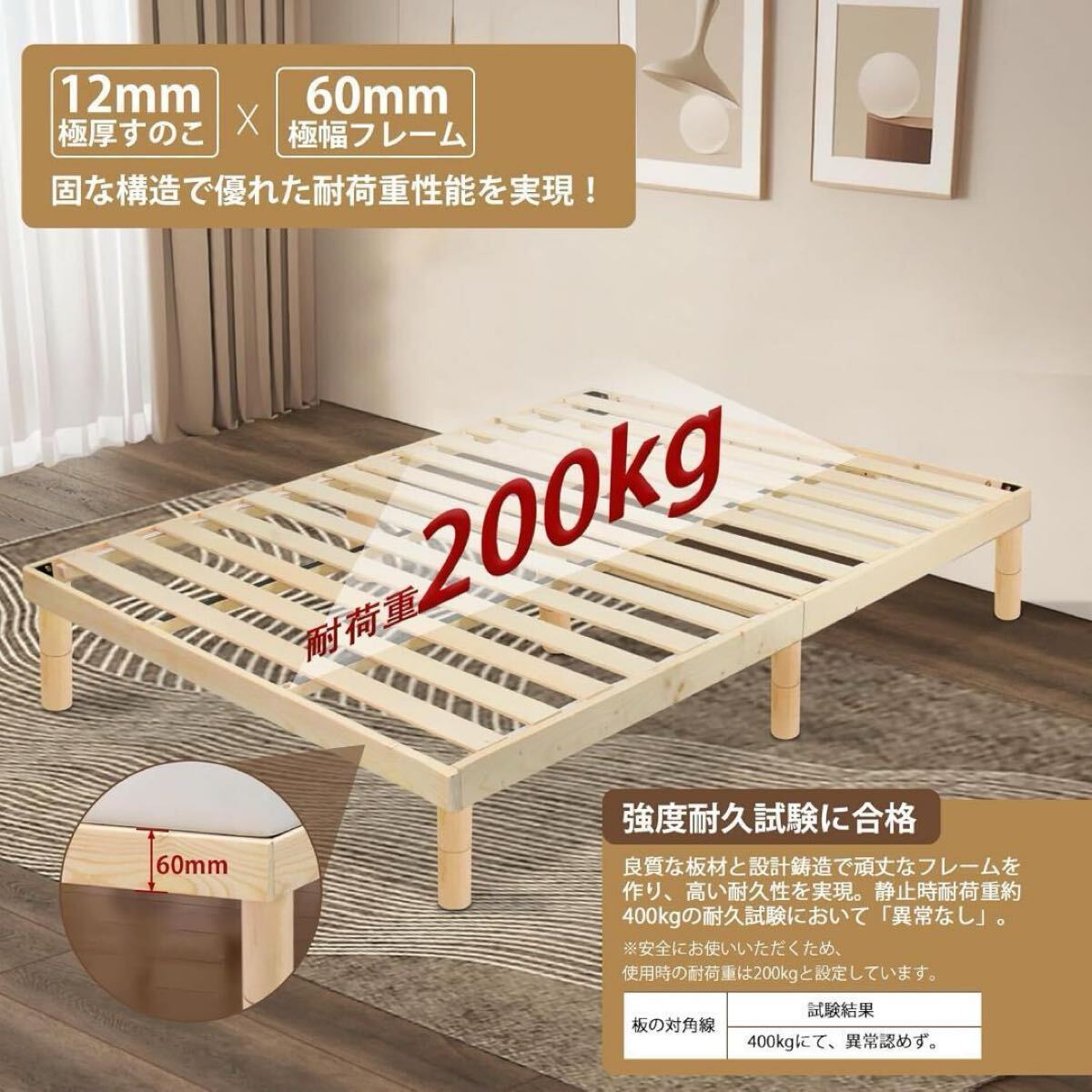 厚いすのこと独自のフレーム構造により、驚異的な耐久性を実現。圧力分散設計により安定性が向上し、耐荷重は200kgまで対応(強度耐久試験に合格)。耐久性に優れたLVL積層合板のすのこを使用しているため、割れる心配はありません。さらに、縦の支柱で強力に補強されており、安心して深い眠りをお楽しみいただけます。