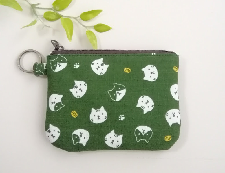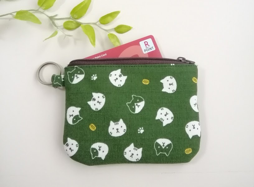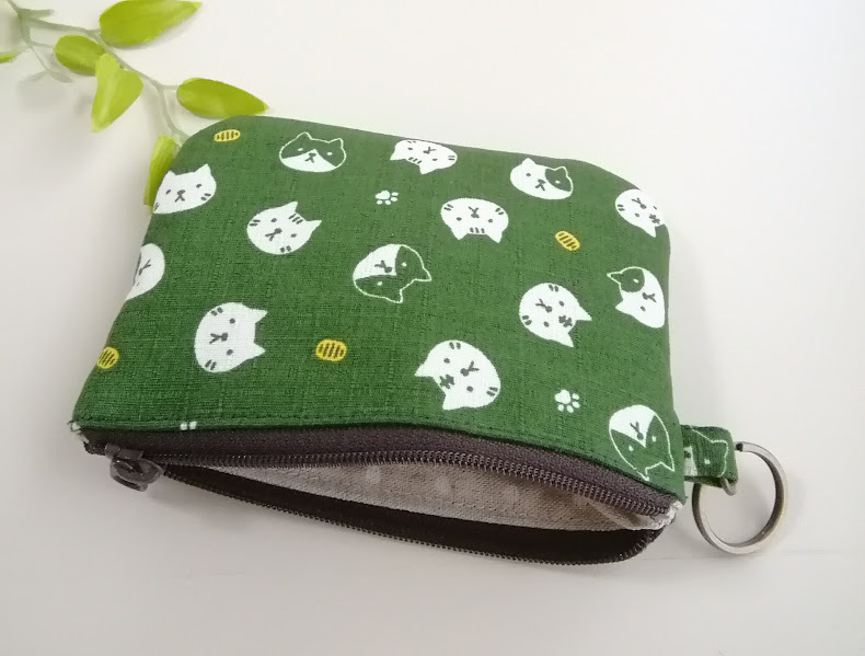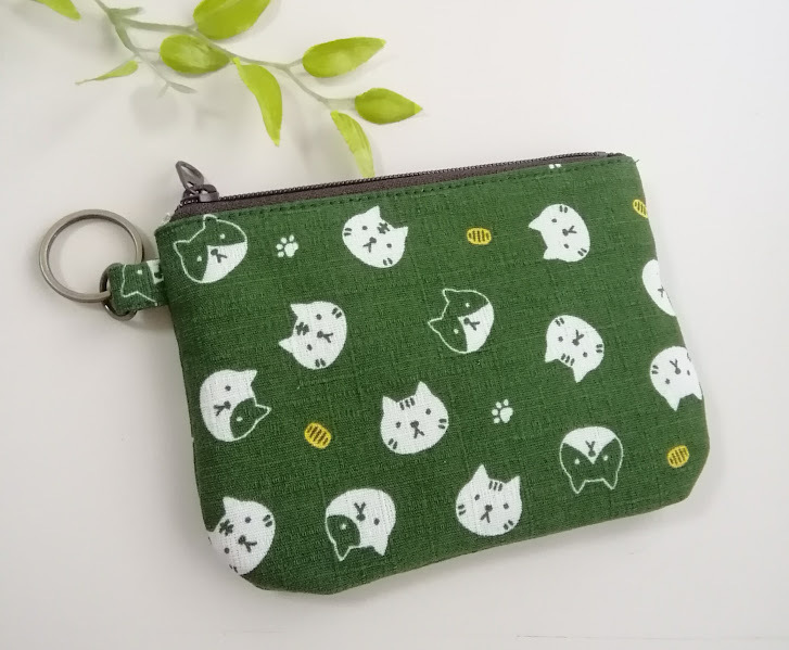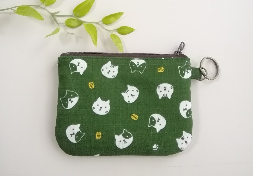 ハンドメイド〈キーリング付き〉フラットポーチ  ドビークロス/和柄*猫に小判 〈13×9.5〉