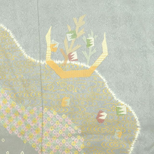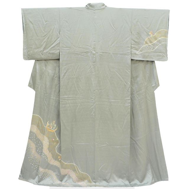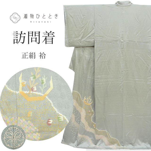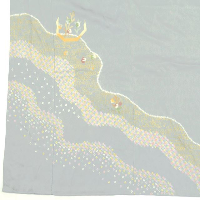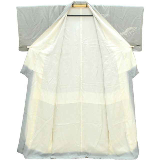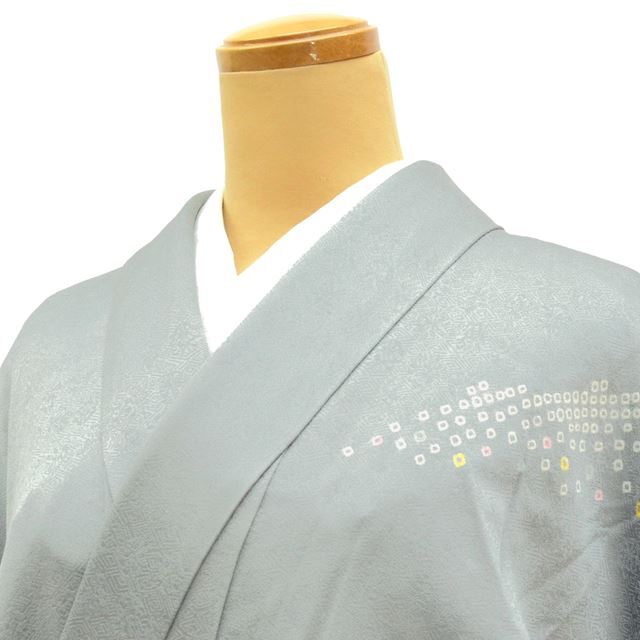 グレー色に観世水などの文様があしらわれ、上品さが感じられるリサイクル付下げ訪問着です。