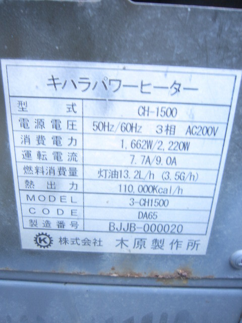 【仕様】灯油110000kcal、200V、50/60Hz、平成13年、ハウス暖房機、大型