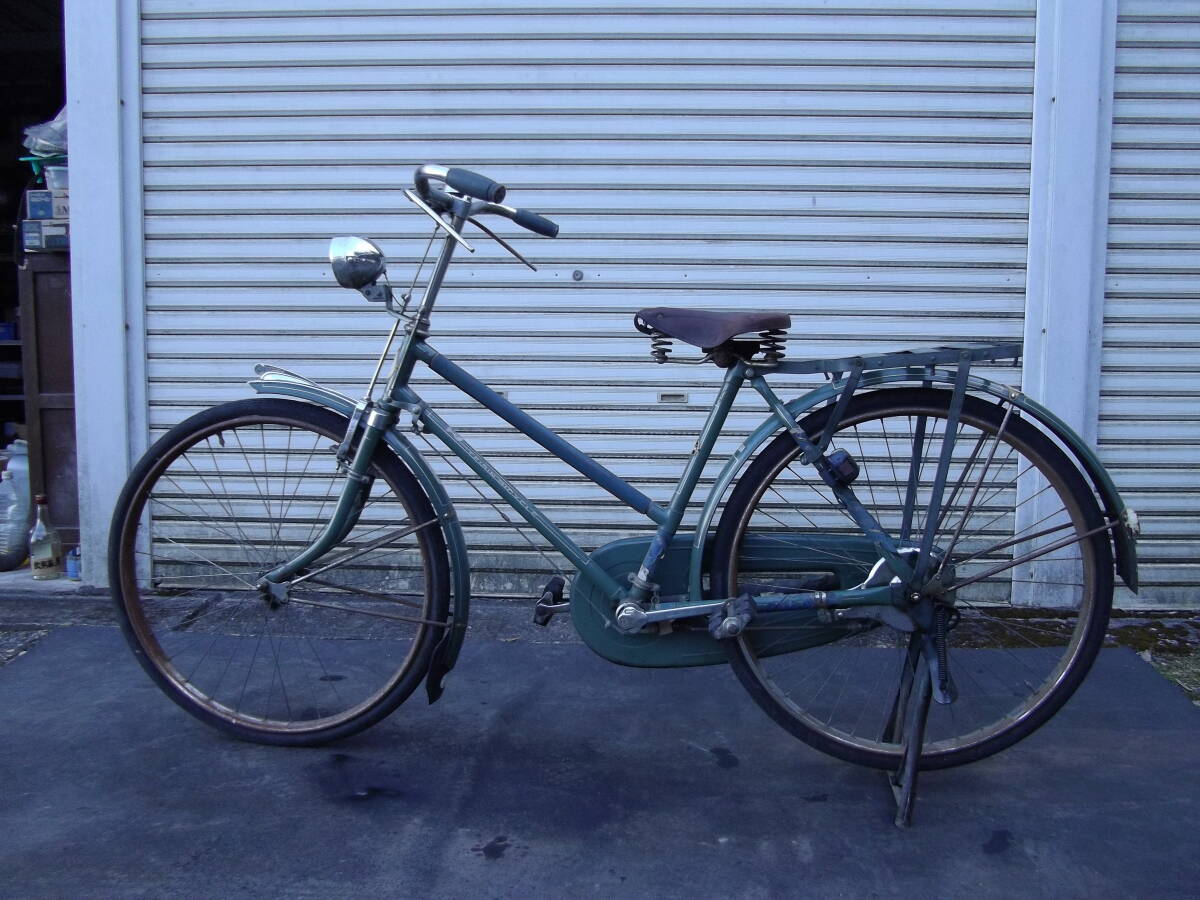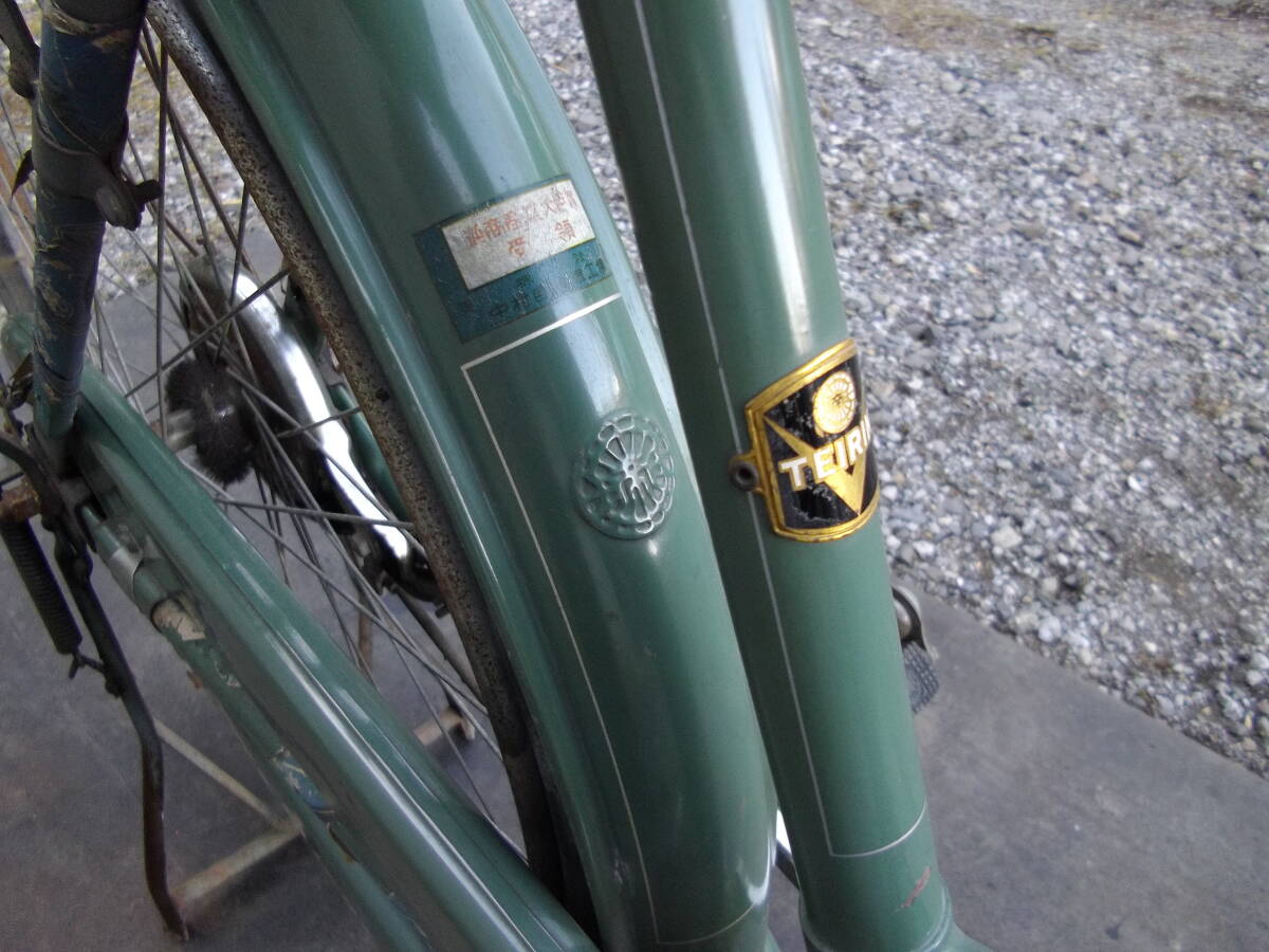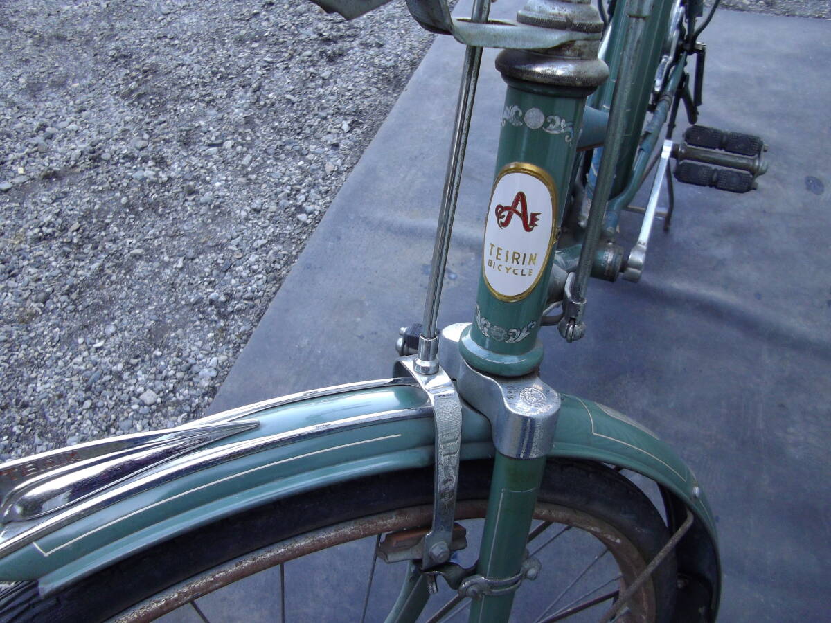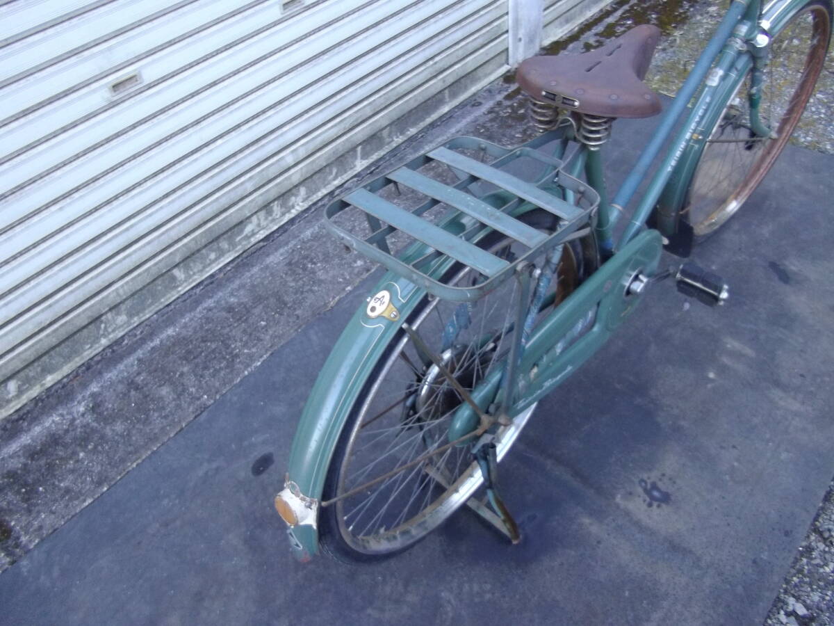 ♪商品説明 | 昭和30年代と思われる帝輪自転車です。都内にあった中村自転車工場という会社のブランドです。30年近く前に入手して以来、ずっと雨も日光も当たらない倉庫に保管していました。入手時より新車のフレーム巻紙が残っていました。倉庫から出して埃を落とした状態です。塗装部分は傷も少なめで当時の塗装がまだ綺麗な状態です。色はオリーブグリーンに近い色味です。ピンストライプやエンブレム、七宝エンブレム等きれいに残っています。入手時はライトが付いていませんでしたので入手後すぐにライトは取り付けしましたが、発電機は取り付けしていません。サドルやベルも帝輪のエンブレムが付いています。リムは一部磨きメッキ部分は磨けば光ることは確認しましたが、全部は磨いていません。次期オーナーのお楽しみ作業となります。現状で走行は軽快に出来ておりますが、本格的に乗る場合は、各部のグリスアップやブレーキゴムの交換等はされた方がよろしいかと思います。当時物の未再生原型車両ですので、錆や傷、劣化等は有る物としてお考え下さい。引き渡しは原則的に当方の保管場所に取りに来ていただける方でお願い致します。保管場所は栃木県の宇都宮市です。また、関東近県、その他日帰りで行ける範囲であれば、配送も可能です。当方の休日に合わせての配送となります。費用は質問欄からお問い合わせください。遠方の方は落札者様が手配した業者の当地の営業所への持ち込みは可能です。持ち込みの場合は現姿のままの持ち込みとなります。画像でご確認の上、ご検討ください。システム上送料は0円と表示されますが実費のご負担が必要です。旧IDがパソコンからログイン出来ず泣く泣く新IDを取得しましたので、こちらのIDは評価があまり有りませんが、旧IDは評価2700以上で99.9%の非常に良い評価でした。ご安心下さいませ。 |