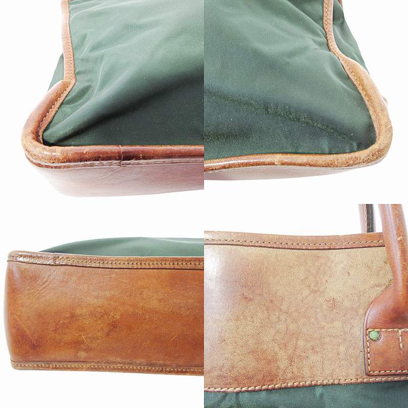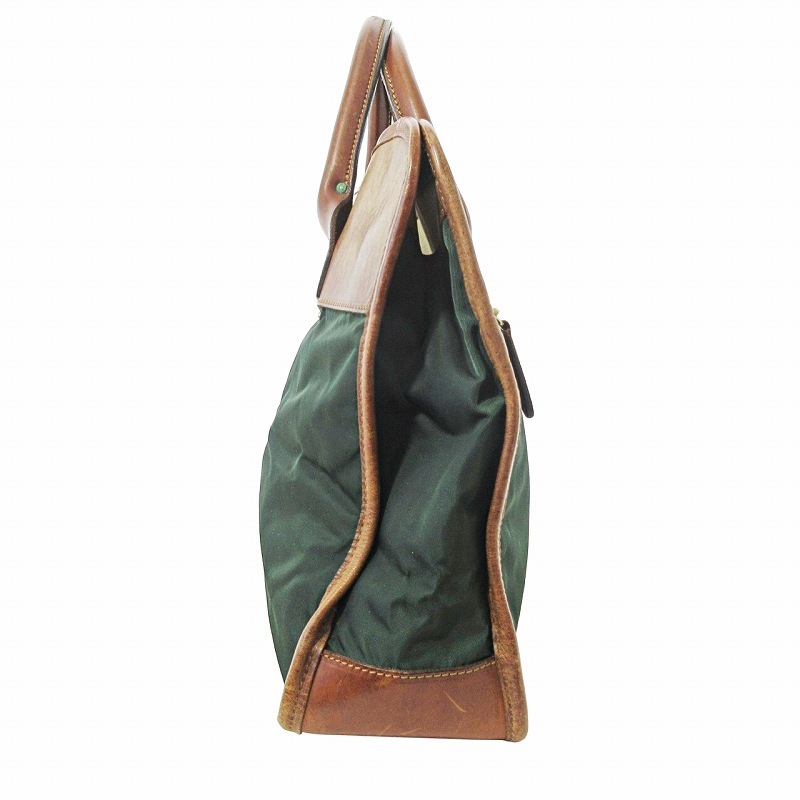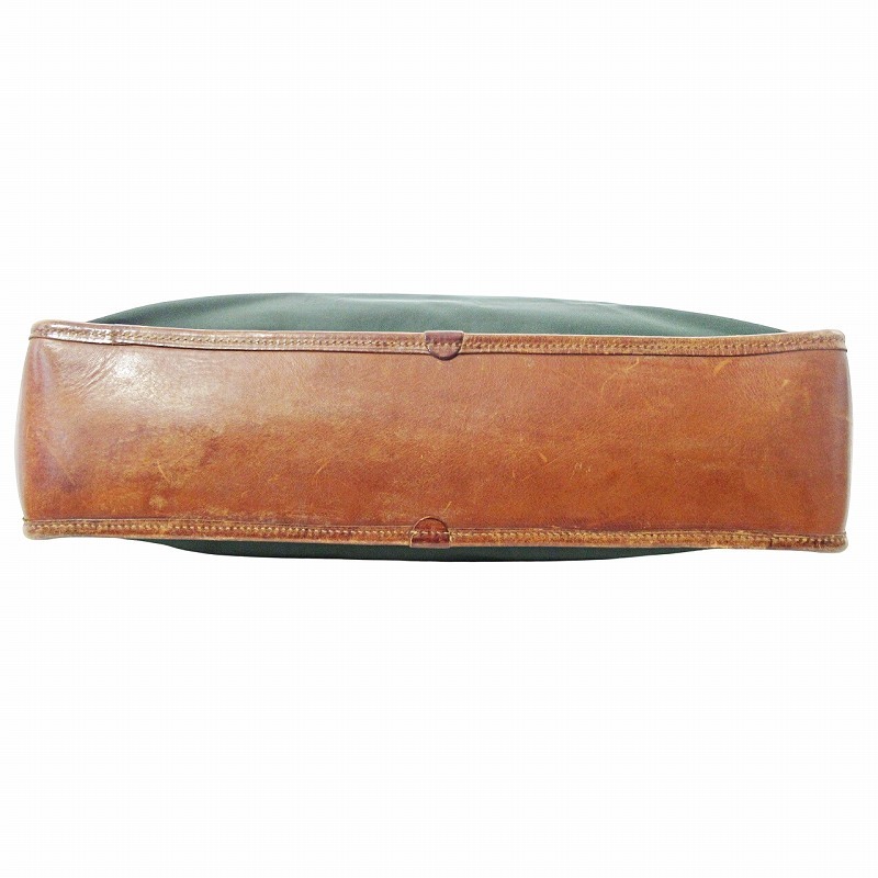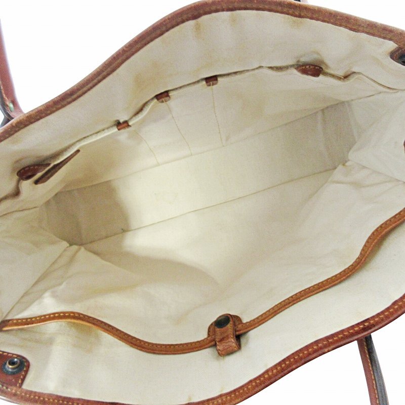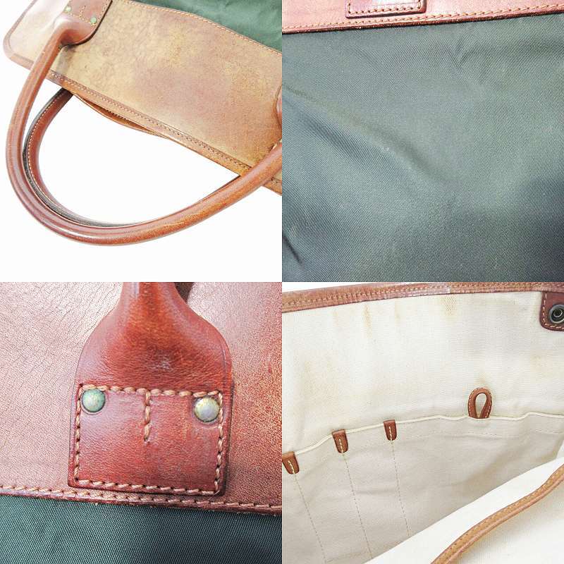 【状態】この商品には下記のようなダメージがあります。 ・型崩れ ・角擦れ ・レザー部分に剥げ ・内側に汚れ ・金具に緑青の付着 ・持ち手に黒ずみ ・表面に汚れ ※全体的に中古品としての使用感と上記のようなダメージがありますが、通常使用には支障のない商品です。掲載写真や記載内容をご確認いただき、ご理解の上ご購入ください。