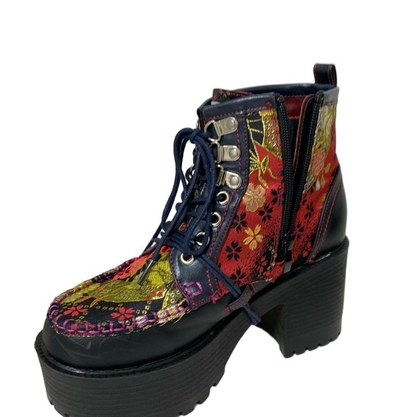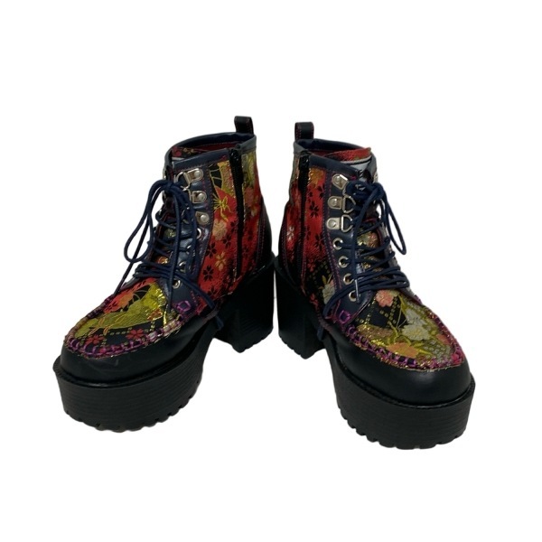 ヨースケ YOSUKE ショートブーツ M - 黒×ゴールド×マルチ レディース 花柄/和柄/レースアップ/サイドジップ 靴