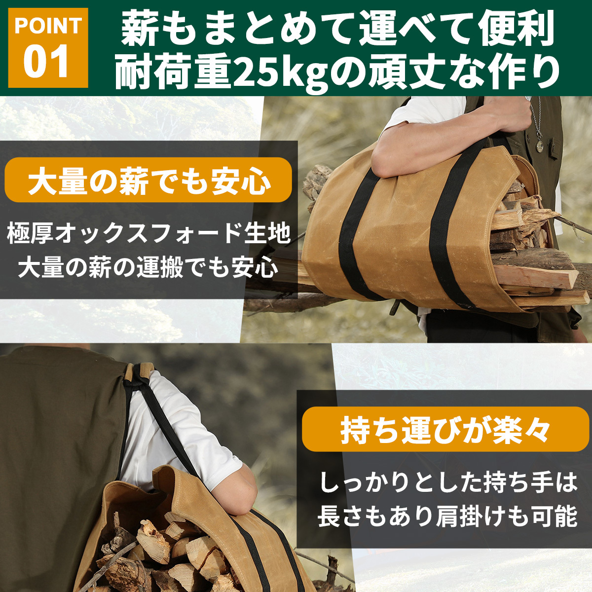 ◆【高強度生地の二重構造】高品質オックスフォード生地を一般的なログキャリーが一重の所、二重に重ねて使用しており、強度は抜群です。生地には撥水加工が施されており薪を濡らさず、湿気から守りることができます。
