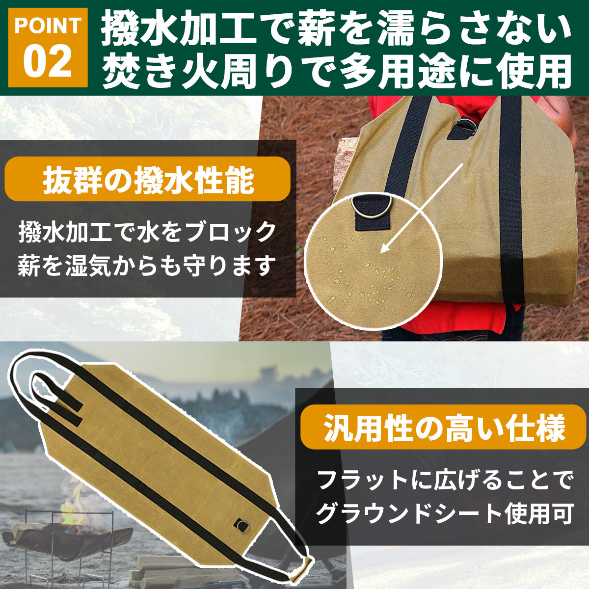 ◆【薄型コンパクトに収納】薄型コンパクトな作りで、使用していない時は折り畳んで収納できるので場所を取りません。シート状で焚き火スペースにグランドシート代わりにそのまま敷いて薪を置いておけば薪を湿気から守ることが可能。