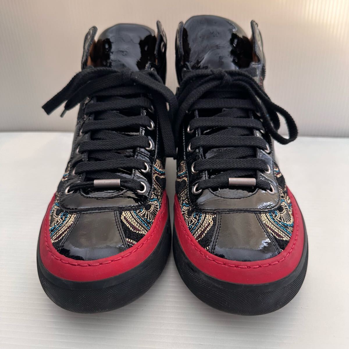 光沢のあるパテントレザーと、華やかな刺繍入りファブリックを組み合わせたデザインが特徴的で、ラグジュアリーかつエッジィな印象を与えます。赤いミッドソールがアクセントになっており、足元にインパクトをプラスしてくれます。