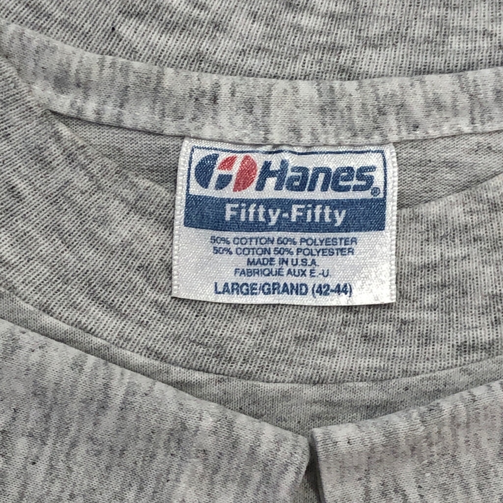 | [商品管理番号] T5718 [ブランド] Hanes/ヘインズ [サイズ] LARGE [実寸サイズ] 肩幅:約48cm 着丈:約65cm 身幅:約52cm 袖丈:約20cm [主な素材] 表地 : コットン [色] グレー [仕様] 生産国 : USA製 90年代 シングルステッチ [状態] 汚れ:肩、脇、背中、裾 キズ:脇 特記事項:プリント劣化、首元ヨレ | |||