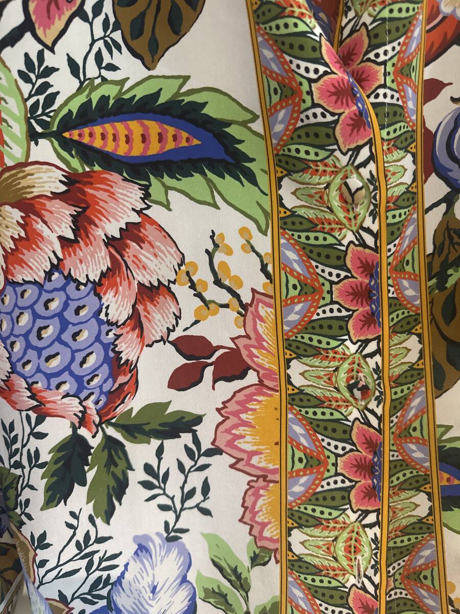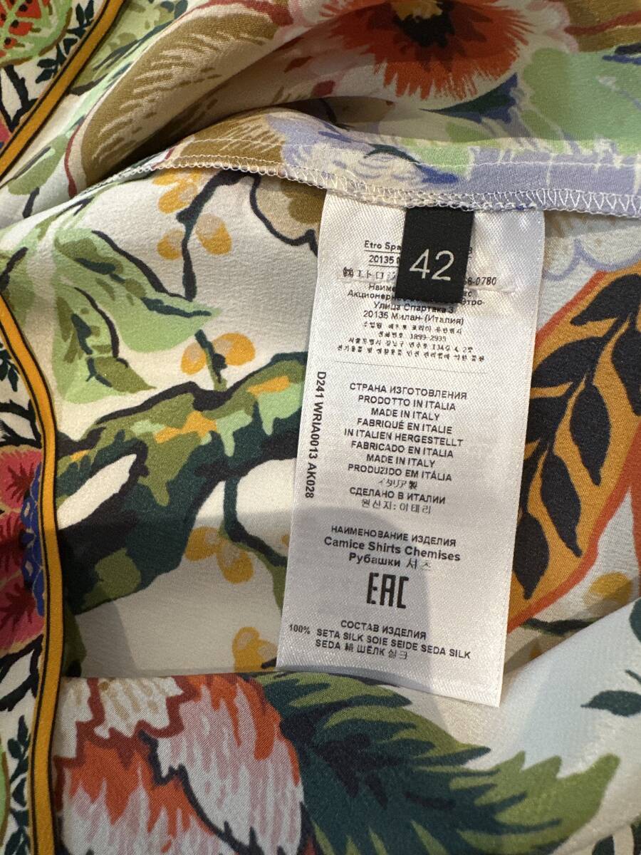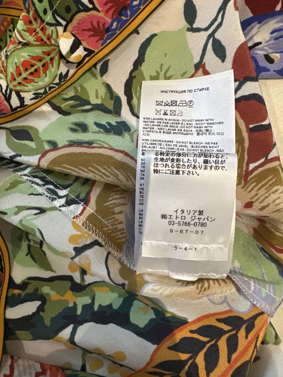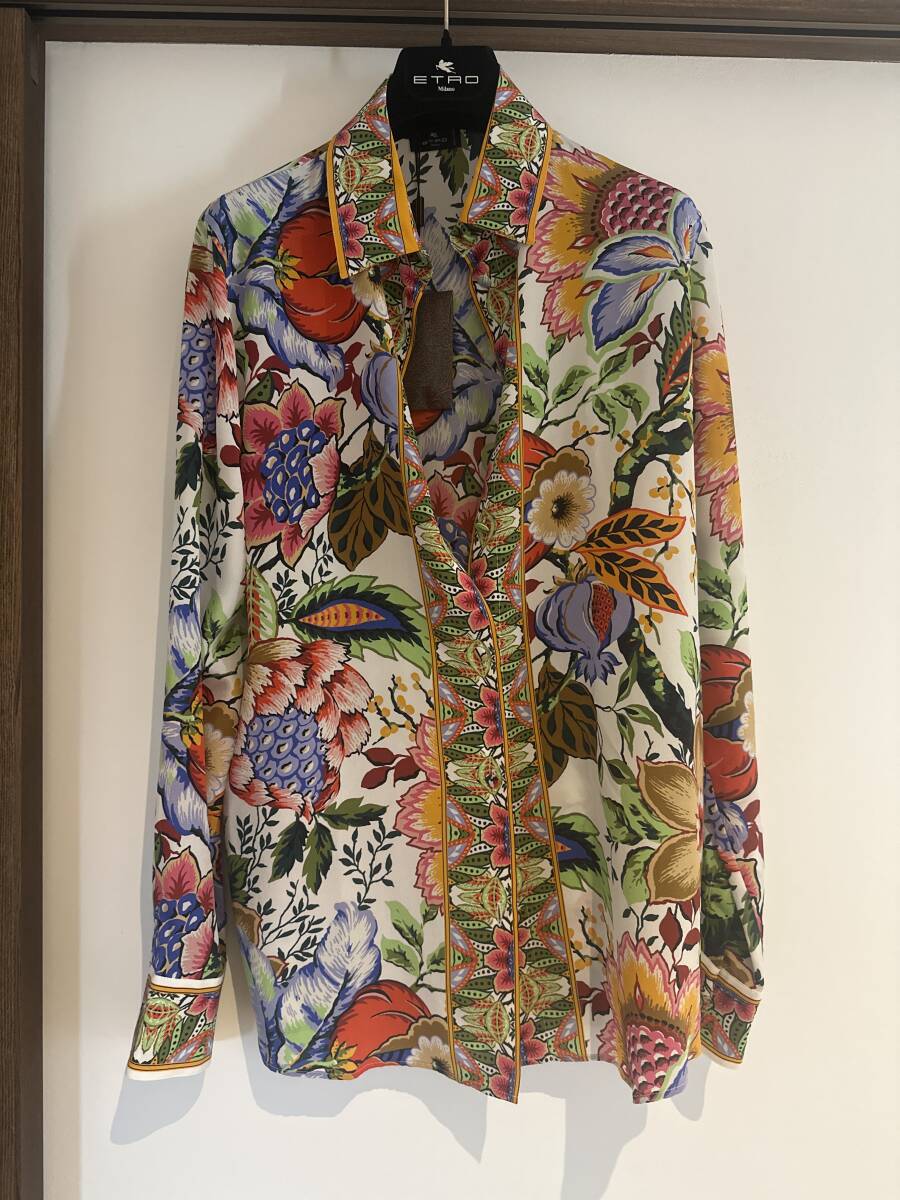 エトロのとても高級で素敵なシルクブラウスです。素敵な柄に一目惚れして購入しましたが、着る機会がないので。サイズは42です。身幅平置き約51センチ、着丈約68センチ試着のみ新品です。デニムに白タンクトップ着てオーバーシャツにしても可愛いと思います。ノークレーム、ノーリターンでお願いいたします。