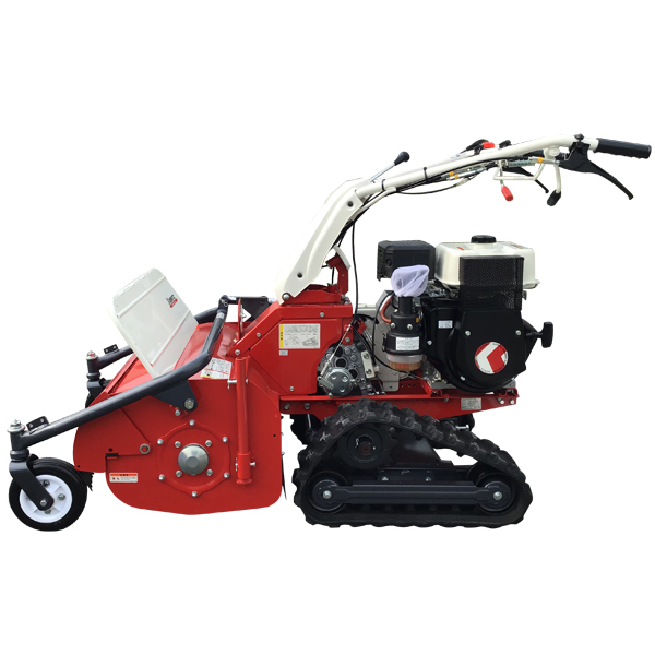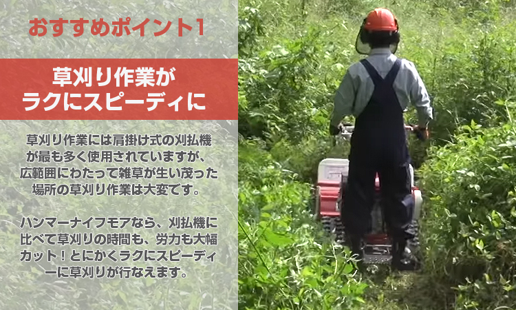 | 背丈の高い草や空き地の草刈に最適なハンマーナイフモア ●背丈の高い草や硬い草も細かく粉砕します。 ●刈った草は細かく粉砕され腐食・堆肥化が早いです。 ●クローラ走行を採用で、不整地・傾斜地でも安定した走行ができます。 |