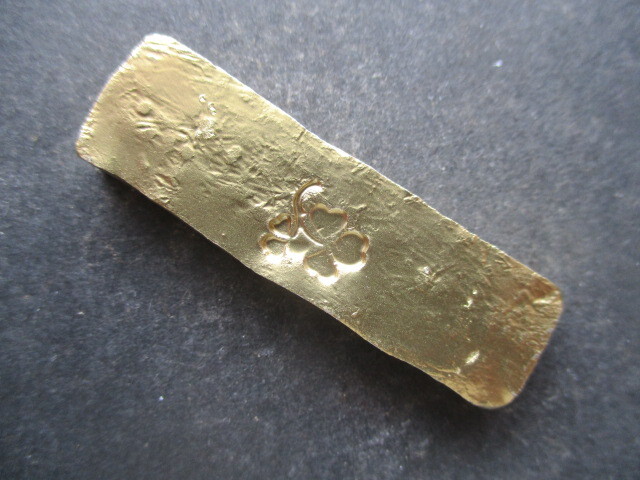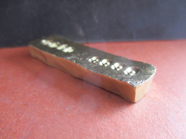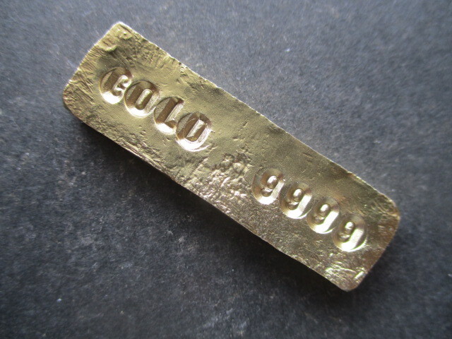 今回は委託品です。金塊の表には「GOLD 」および「9999」(フォーナイン)が刻まれています(2枚目の画像)。裏の刻印は溶解業者のものと思われます(3枚目の画像)。数年前にヤフオクで入手し、落札価格は計10000円ほどとのことですが、早期の換金のため大幅に安く出品することに同意していただきました。当時は本物ではないことが明記されて出品されており、それを承知で落札したそうです。もう十分に楽しみ、手放すことになりましたが、昨今の金価格高騰により悪用されることを案じる委託者の意向でタイトルに「悪用厳禁」と書かせていただきました。確かに気持ちはわかります。見た瞬間、本物に間違いないと思ってしまいました。本物とは大きさや重さを変えて作ってあるそうですが、危なく本物と信じて出品するところでした。撮影の際の光の量によって実物と違った色に写ることがあります(1枚目の画像が最も実物の色に近いように思います)。自己紹介欄にオークション休業日を記載させていただいております。お手数とは存じますが、ご入札前にお読みいただければ幸いです。