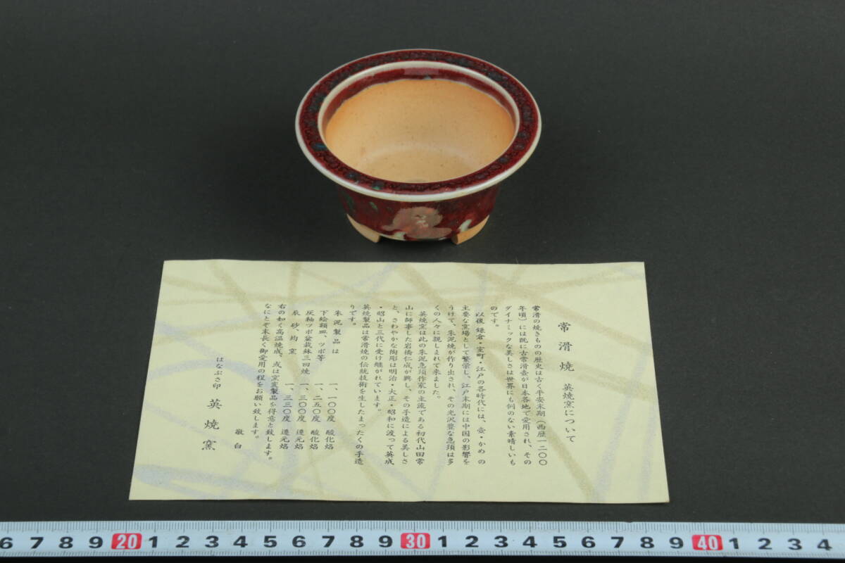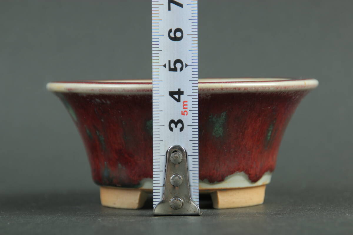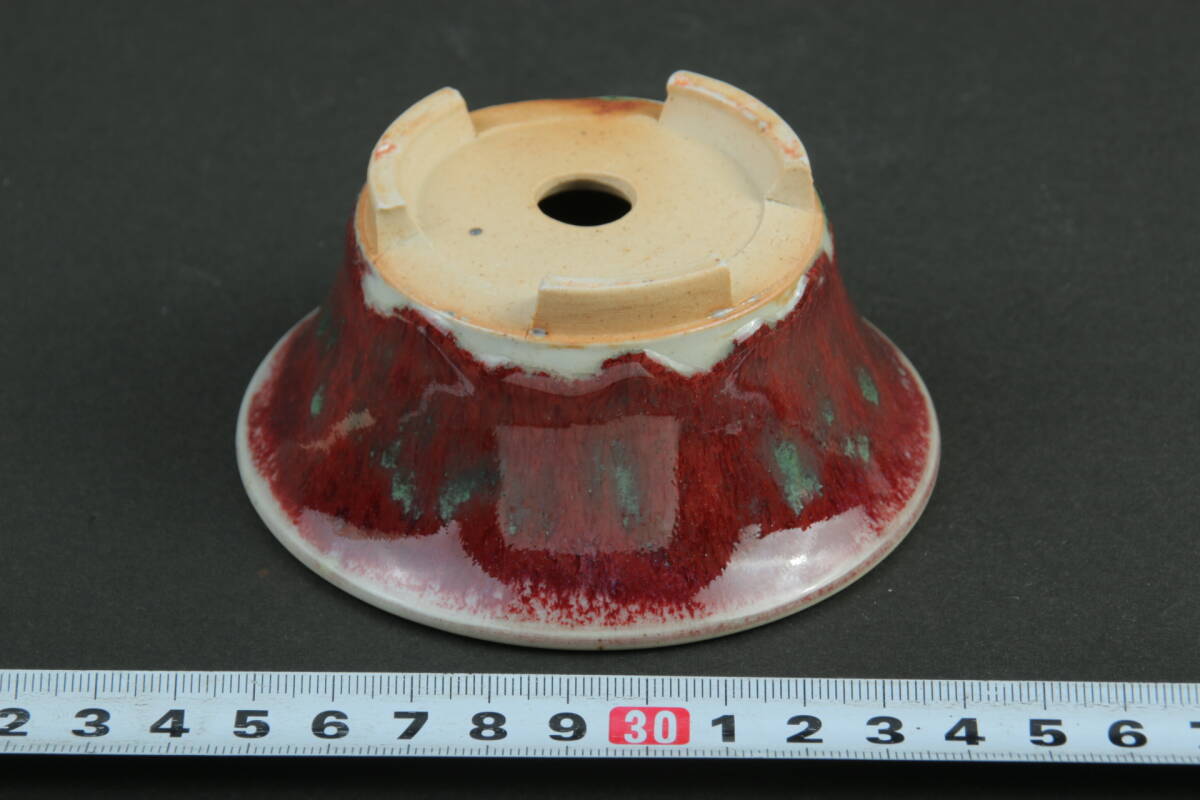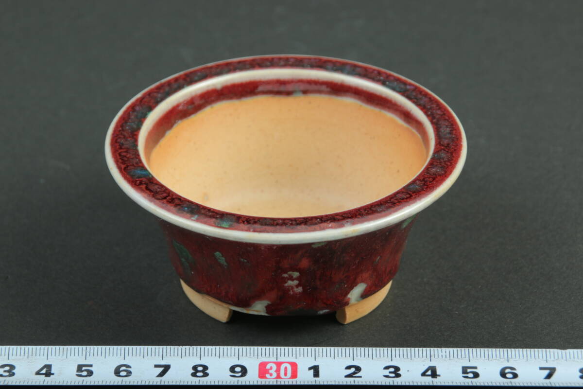 70561 新品未使用品 盆栽鉢 常滑焼 赤窯変天目 赤海鼠釉 丸反外縁下帯切足 英焼窯 昭山 栞付 (師 初代常山 山田常山) 直径10×高さ4.5cm