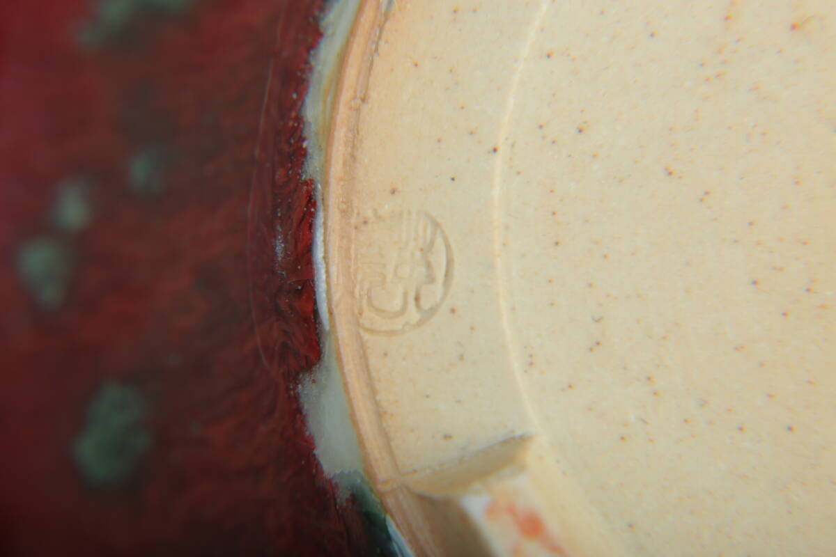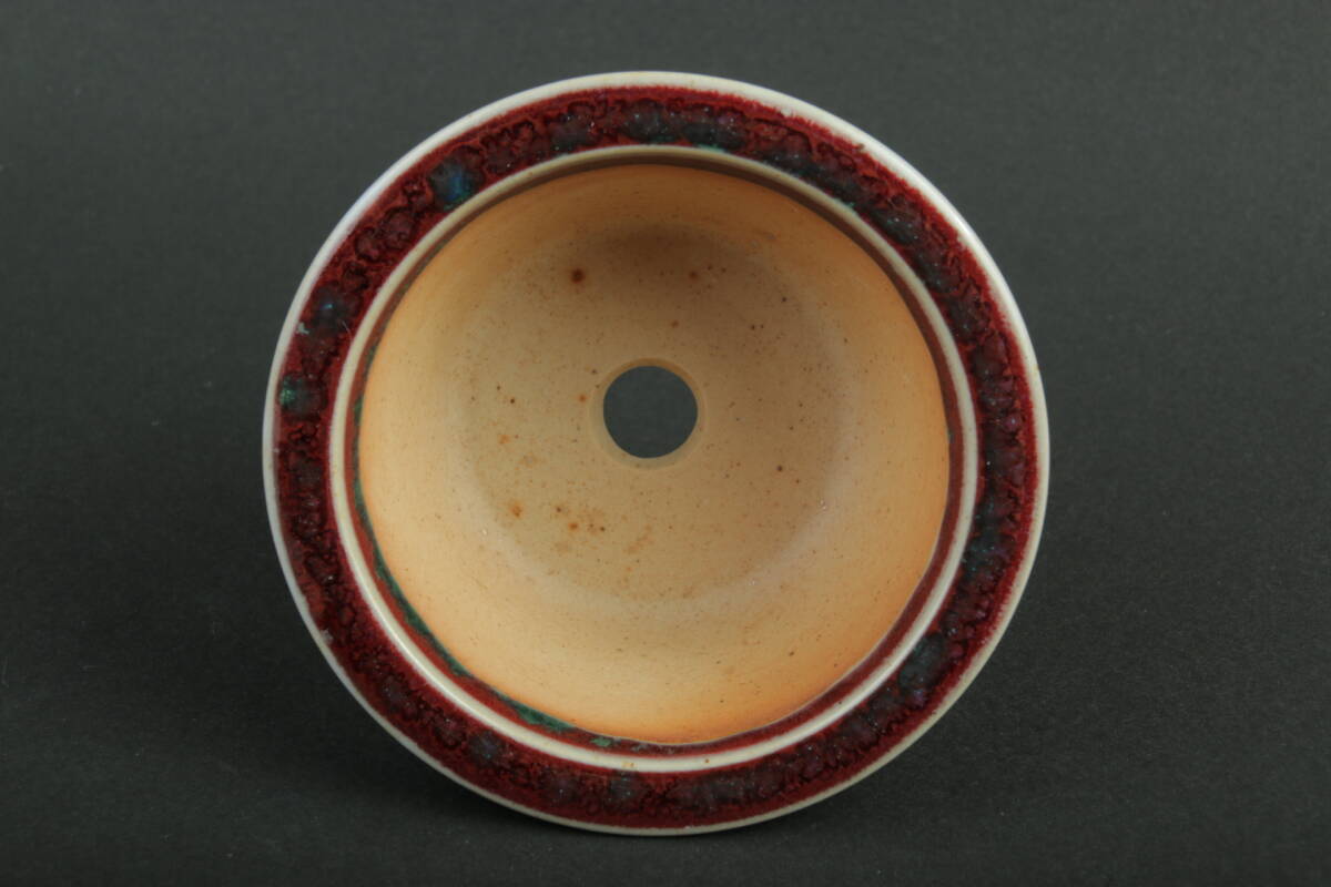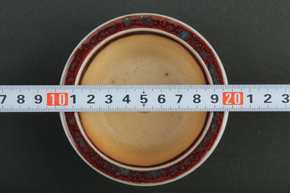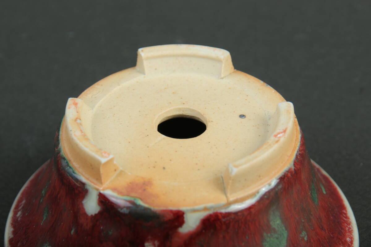 70561 新品未使用品 盆栽鉢 常滑焼 赤窯変天目 赤海鼠釉 丸反外縁下帯切足 英焼窯 昭山 栞付 (師 初代常山 山田常山) 直径10×高さ4.5cm
