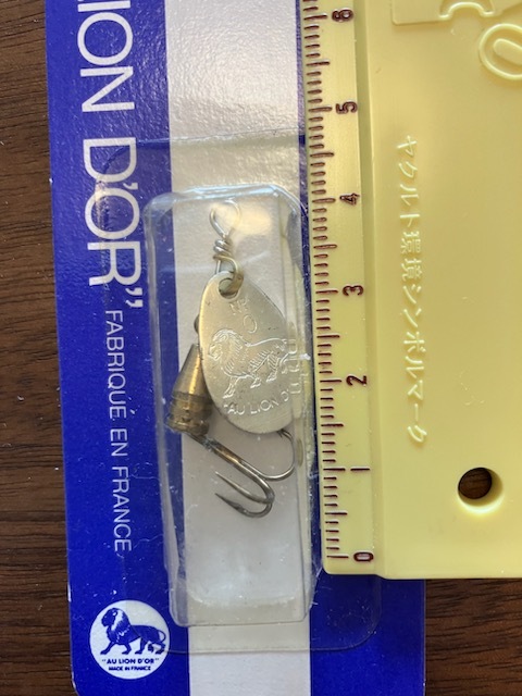 未使用ですが、本体とパッケージの劣化は、画像をご参照下さい。ノー・クレーム、ノーリターンをご了承いただける方の入札をお願いいたします。コータック時代のフランス製オ・リオン・ドール2.5gです。ブレードは、シルバー地です。(パッケージごと測った実測重量が5.2gで、パッケージは3.5gのものとプラスチックも台紙も同サイズなので2.8gとすれば、ルアーは2.4gになりますが、おそらくどちらかの公差の範囲でしょう。)ブレードは、サイズ「No.0」、社名、ライオンの絵柄の刻印がなされた質感有る仕上げです。トラウト用としては、渇水期や小渓のパイロットルアーでも、先発完投でも行けるオールラウンダーサイズかと思われます。発送手配は、極力、早期(可能なら24H以内)にいたします。クリックポストなら対応可能です。(定形外は遅れる可能性有り。)発送は、クリックポスト(\185)、または定形外(\120)を想定していますが、定形外は追跡不可で事故等の可能性をご了解下さい。なお、クリックポストは厚さ3cm以内なら、重量1kgまで同一料金です