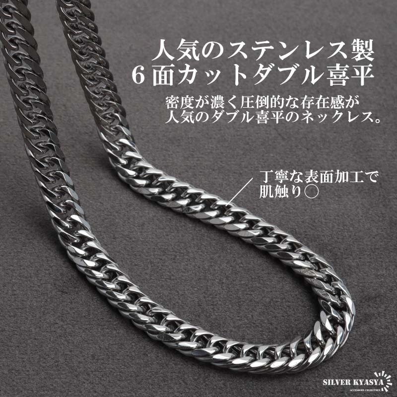 | 商品概要 | ■6面カットダブル喜平 密度が濃く圧倒的な存在感が人気のダブル喜平のネックレス。 ■こだわりの留め具 留め具にも喜平の模様を取り入れてあり、デザイン性の高い仕上がり!見た目で差がつくアイテムです! ■ステンレス素材を使用 金属部分は頑丈なことで知られるステンレス素材を採用。耐久性はもちろん耐水性も高く水場での着用も可能。金属アレルギーも出にくいとされている金属です。  |
