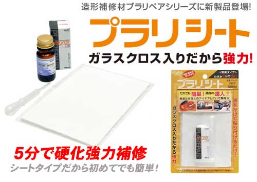 商品説明 | 液をかけて貼り付けるだけ!(即硬タイプ) わずか5分でOK!補強・補修は思いのまま。 【セット内容】 ガラスクロス:1枚(サイズ:100mm×150mm) プラリペア専用リキッド:10ml スポイト:1個 【プラリシートって?】 プラリシートは、造形補修材プラリペアシリーズの新しい仲間です。ガラス繊維クロスにプラリペアパウダーを板状にしてコーティングした新しい補修シートです。 取り扱い方法も単純だから、誰でも簡単にFRP(ポリエステル樹脂)はもちろんプラスチック製品も補修可能!しかも強度抜群! 長期間の保存も可能で、ハサミやカッターナイフでカットして必要なときに必要な分だけご使用いただけるから無駄がなくて経済的! FRPをはじめ各種素材に化学結合あるいは付着接着するので、補修材料としてはもちろん、補強材料や造形材料としても幅広くご利用いただけます。 【プラリシートの特徴は?】 プラリシートは、合成樹脂のパウダーを付着させたグラスファイバーシートに専用リキッドを混合し重合硬化させる補修剤です。 各種素材(対象物参照)に化学結合あるいは付着接着します。 接着材料、充填材料、補修、造形材料(穴うめ、欠けた部分の補修)、絶縁材料などとしてご利用いただけます。 硬化後、グラスファイバー入りの樹脂になりますので、大きな力や振動の加わる部分の補修も安心。 硬化が早い(5分/25℃)ので、即日に取付けや研磨が出来、表層に塗装、メッキなどの仕上げ処理ができます。 【プラリシートを使う局面は?】 上記のとおり利用の局面はさまざまですが、考え方の目安の1つとして、ガムテープで固定するような箇所で、 「そのままガムテープが硬く固まればいいのに」 と思うような箇所が挙げられます。 当方の場合、自宅の壁面の電源コンセントのカバーが大変外れやすく、これを従来ガムテープで固定していました。 ガムテープも素材との相性などもあって徐々に剥がれてくるため、時々貼りなおす必要があり不便です。 そこで、ガムテープの代わりにプラリシートで固めてやったところ、外れてくることはなくなりました。 ★プラリシート使用方法★ 関連商品 |