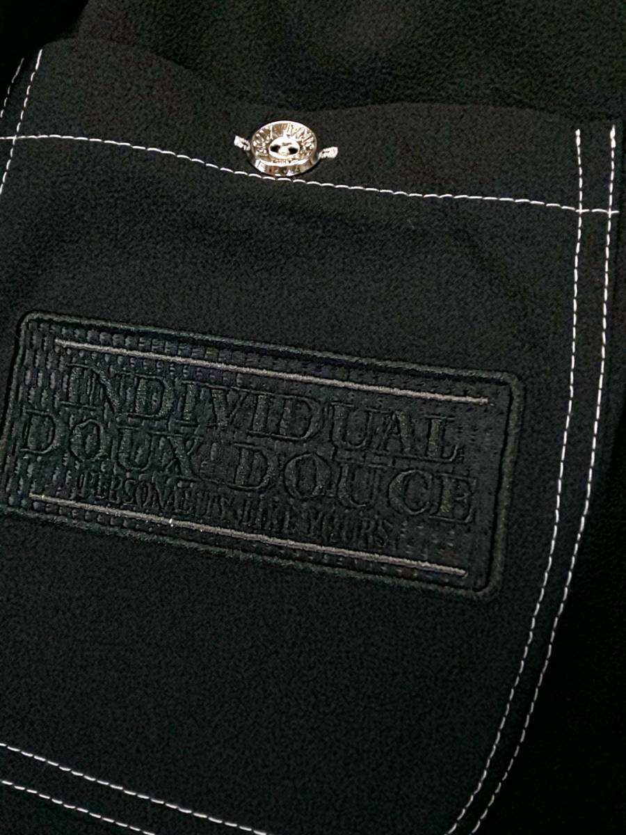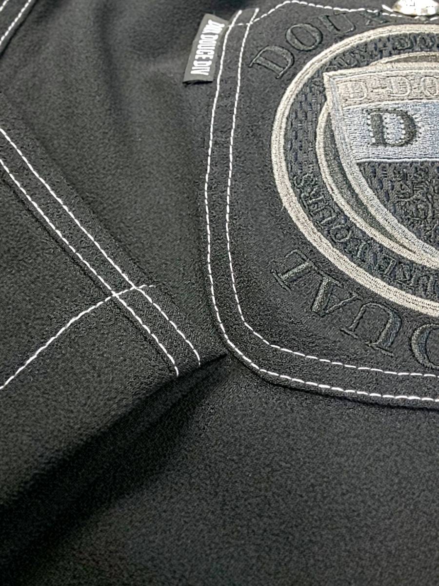 ちりめんの様な黒地に白のステッチ、後ろにポケットの刺繍のエンブレムとロゴがインパクトある