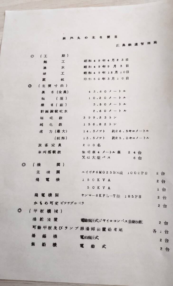 瀬戸丸の詳細を記載した広島鉄道管理局の資料です。コレクションの一つとしていかがでしょうか。