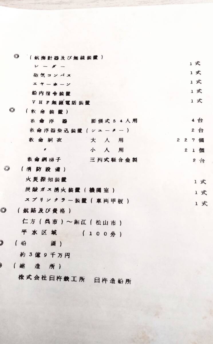 国鉄 連絡船「瀬戸丸」の詳細を記載した主な要目資料です。瀬戸丸はかつて広島県仁方港と愛媛県松山市堀江港に就航していた国鉄の連絡船でした。1982年廃止。