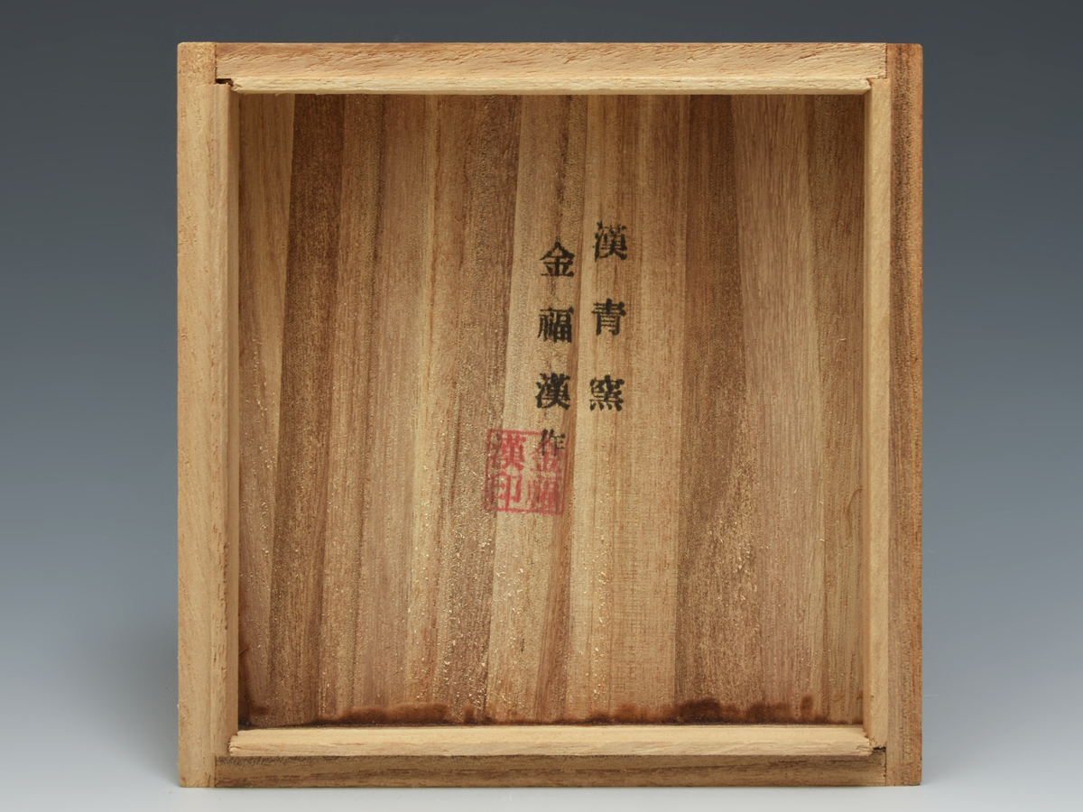 漢青窯の陶工・金福漢による、高麗青磁象嵌雲鶴文の茶碗です。 淡い青磁釉の中に、象嵌技法により丁寧に文様が施されています。 見込みには、雲文の中を飛ぶ鶴の姿が象嵌で描かれ、やわらかくも気品ある仕上がりとなっております。 高麗青磁の伝統を継承しながらも、現代的な洗練を感じさせる一碗となっており、鑑賞・実用の両面でお楽しみいただけるかと思います。 共箱に若干の使用感が見られますが、その他に目立ったダメージ等はなく、全体としてコンディションは良好です。 ※撮影の際に生じた写り込みなどがございます。 ※タイトルの(検)以降は検索ワードです。 ご理解の程よろしくお願い致します。 |
