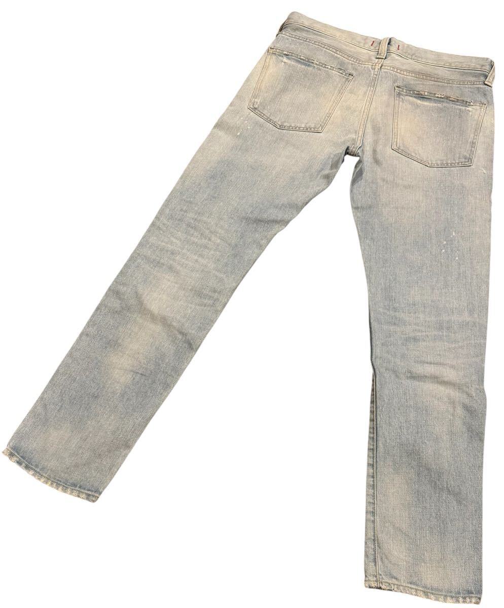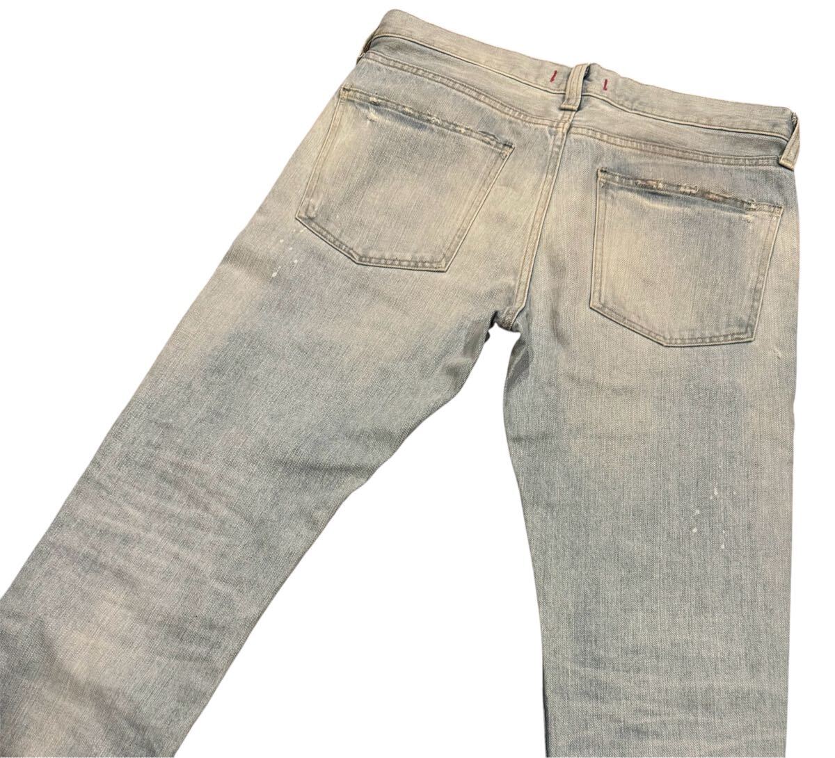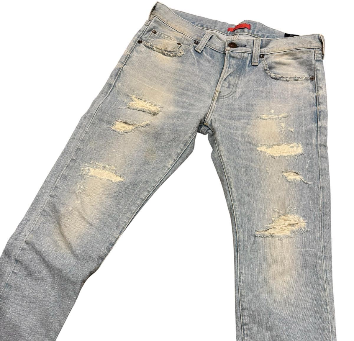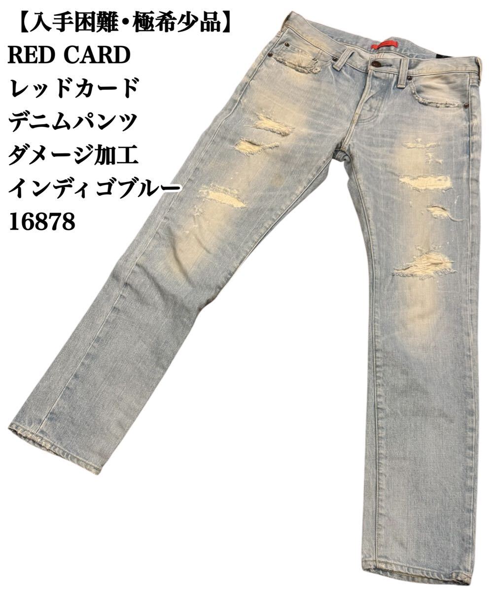 ダメージ加工が施されたインディゴブルーのRED CARDデニムパンツ。
