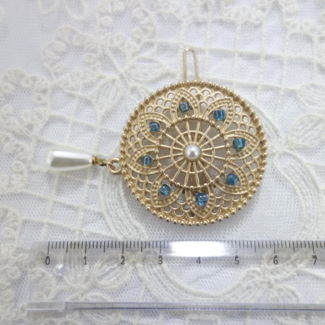 アンティーク調 髪留め ヘアピン 繊細デコ パール&ブルートパーズ色輝石