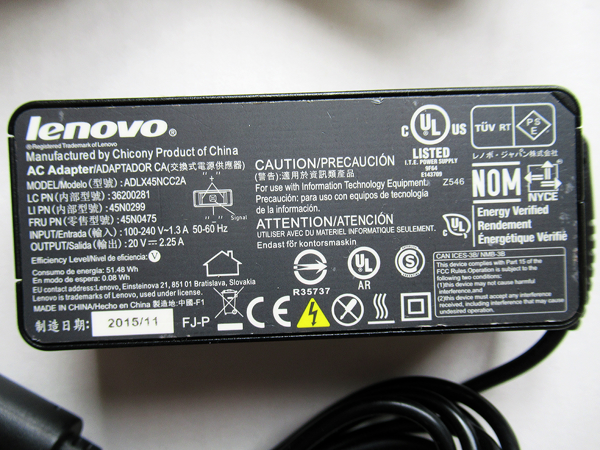 レノボ純正品 ACアダプタ ADLX45NCC2A / FRN No. 45N0475 / 20V 2.25A 45W (四角形センターPIN)