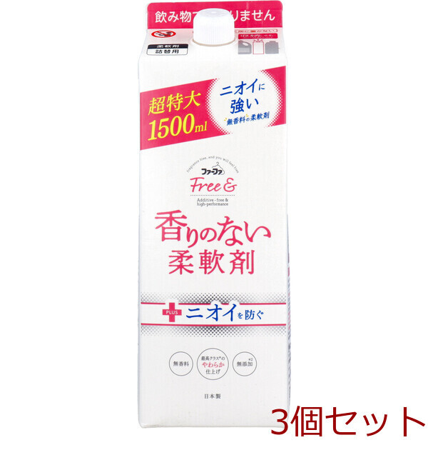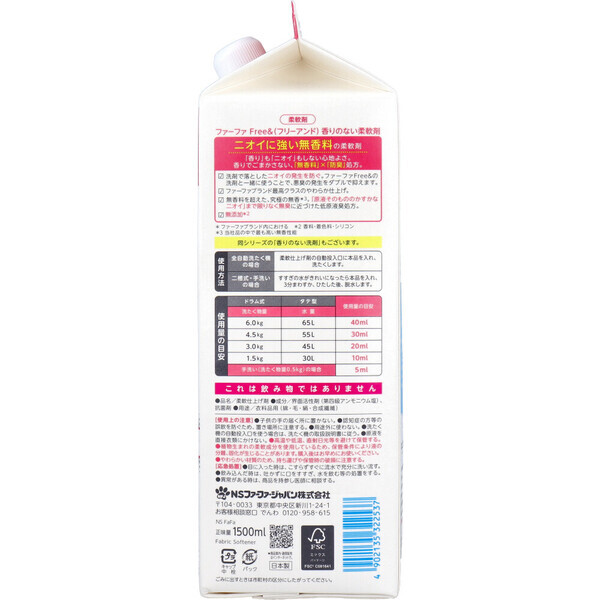 「香り」も「ニオイ」も、とことん無臭にこだわりました! 無香料、だけじゃない。 ニオイの少ない原料を厳選した香りのない柔軟剤です。 ・無香料だからこそ気になる、「原料のニオイ」まで研究し、無臭に近づけました。 ・植物由来の抗菌防臭 香りでごまかさず、部屋干しや、着衣中のイヤなニオイの発生を防ぎます。 ・4つの無添加(香料・着色料・抗菌剤・シリコン)。 ・肌にやさしい、ふんわり仕上がり。 ・こんな時にもおすすめです。 ・においづわりがあるプレママのマタニティライフのお洗濯に。 ・布マスク・エコバッグのお洗濯に。 ・匂いに敏感な嗅覚を持つ犬や猫などのペットの飼い主様のお洋服にも。 ・皮膚刺激テスト済み ※すべての人に皮膚刺激が起こらないという事ではありません。 ・詰替用です。 ★『ファーファFree&』とは 無香・無添加が特徴の、香りが苦手な人の「ストレスフリーな生活」を叶えてくれるランドリーシリーズ。 個装サイズ:85X260X85mm 個装重量:約1572g 内容量:1500mL 製造国:日本 【発売元:NSファーファ・ジャパン株式会社】 【品名】 柔軟仕上げ剤 【用途】 衣料品用(綿・毛・絹・合成繊維用) 【成分】 界面活性剤(第四級アンモニウム塩) 【応急処置】 ・目に入った時は、こすらずすぐに流水で充分に洗い流す。 ・飲み込んだ時は、吐かずに口をすすぎ水を飲む等の処置をする。 ・異常がある時は、商品を持参し医師に相談する。 【使用上の注意】 ・子供の手の届く所に置かない。 ・認知症の方等の誤飲を防ぐため、置き場所に注意する。 ・用途外に使わない。 ・洗たく機の自動投入口を使う場合は、洗たく機の取扱説明書に従う。 ・原液を直接衣類にかけない。 ・高温や低温、直射日光等を避けて保管する。 ・植物生まれの柔軟成分を使用しているため、保管条件により液の分離、固化が生じることがあります 購入後はお早めにお使いください。 注意事項 予告なく成分・パッケージが変更になることがございます 予めご了承ください。 *予告なく成分・パッケージが変更になることがございます。予めご了承ください *ダンボールを使用して発送する場合には、入数以下の個数の場合、 中古ダンボールを使用する場合があり、ご注文の商品とは異なるダンボールになる場合があります。 あらかじめ、ご了承ください。 |