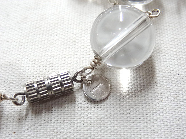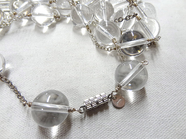 素材不明。石は専門外なので正確にはわかりませんが,あきらかにプラスチックや樹脂等の類のものよりも硬質で重量感があるのでクリスタルではないかと思います。1重でも2重でも好きなように使用可能なデザインです