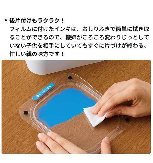 フィルムに付けたインキは、おしりふきで簡単に拭き取ることができるので、機嫌がころころ変わりじっとしていない子供を相手にしていてもすぐに片づけが終わる、忙しい親の味方です!