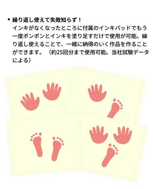 インキがなくなったところに付属のインキパッドでもう一度ポンポンとインキを塗り足すだけで使用が可能。繰り返し使えることで、一緒に納得のいく作品を作ることができます。 (約25回分まで使用可能。当社試験データによる)
