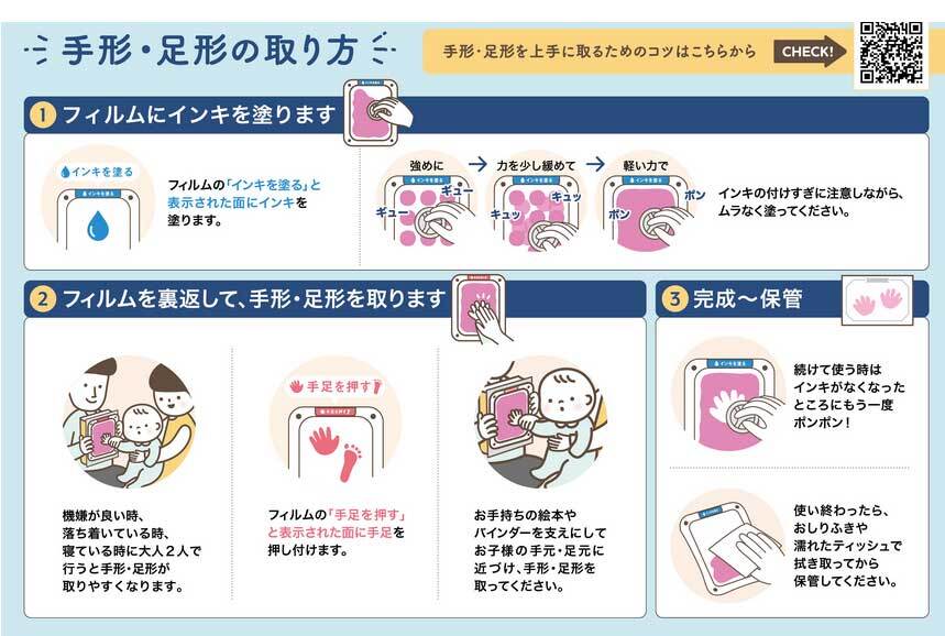 付属のインキパッドを使いフィルムにインキを塗り、その反対面から手足を押すことで、直接インキに触れずに紙に手形・足形を転写できます。