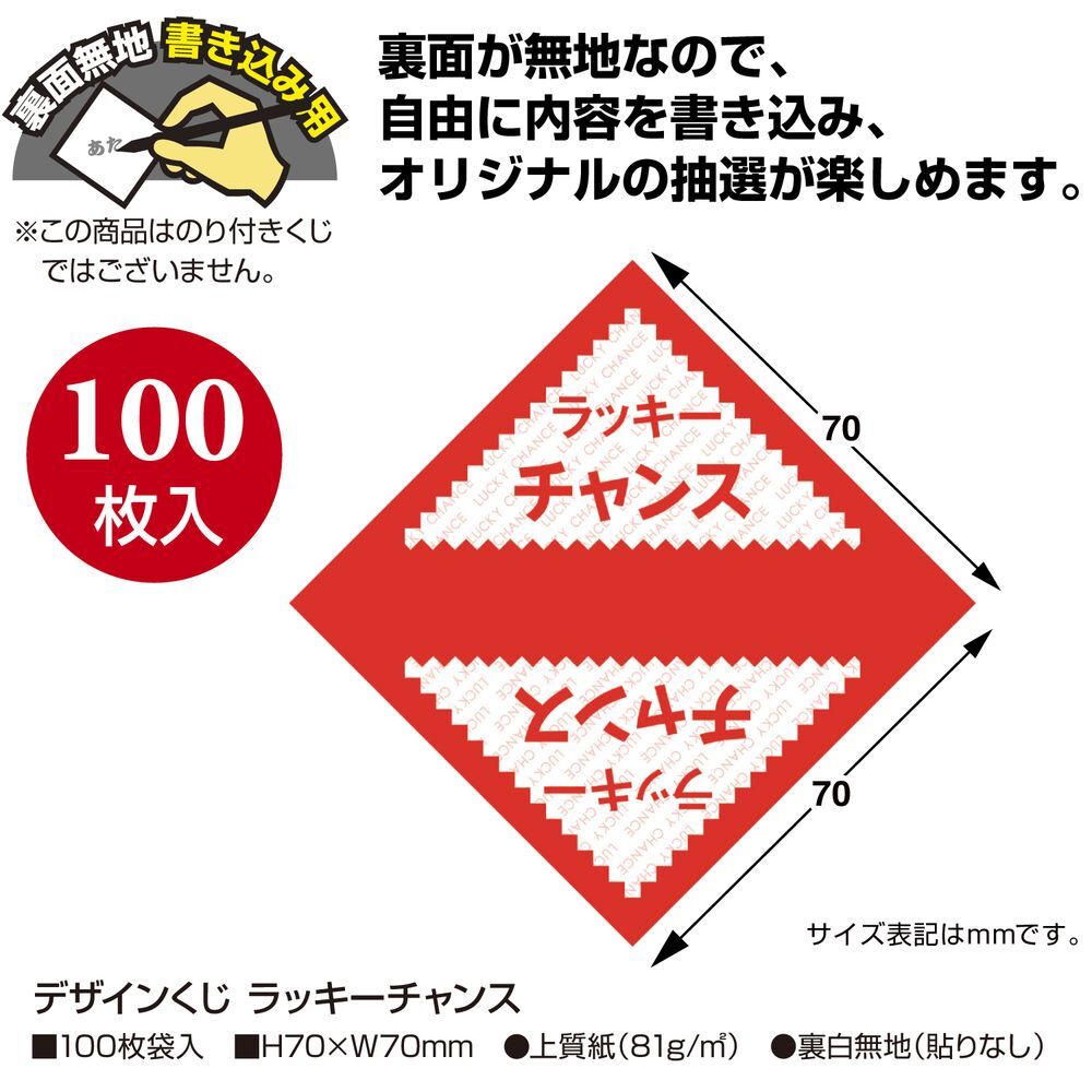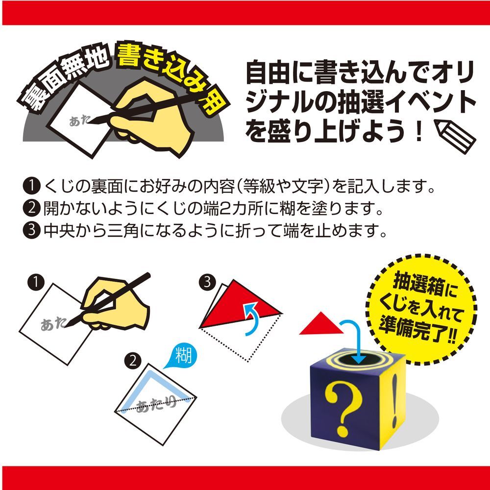 くじの裏面にお好みの内容(等級や文字)を自由に書き込み、貼り合わせるだけでオリジナルのくじが簡単に出来上がります!くじを一から作る煩わしさがありません。