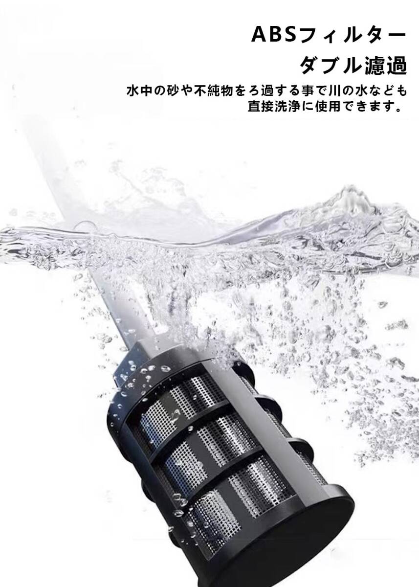 ◆【タンクレス】バケツなどに入れた水をくみ上げる吸水タイプで、専用タンクがないので場所を選ばず使えます
