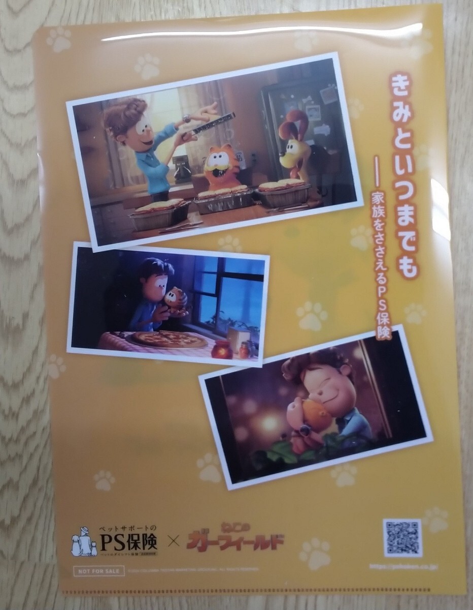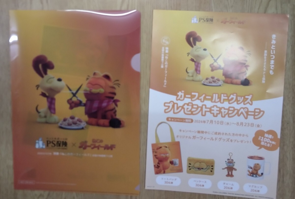 PS保険からいただいたねこのガーフィールドのクリアファイルとチラシです。