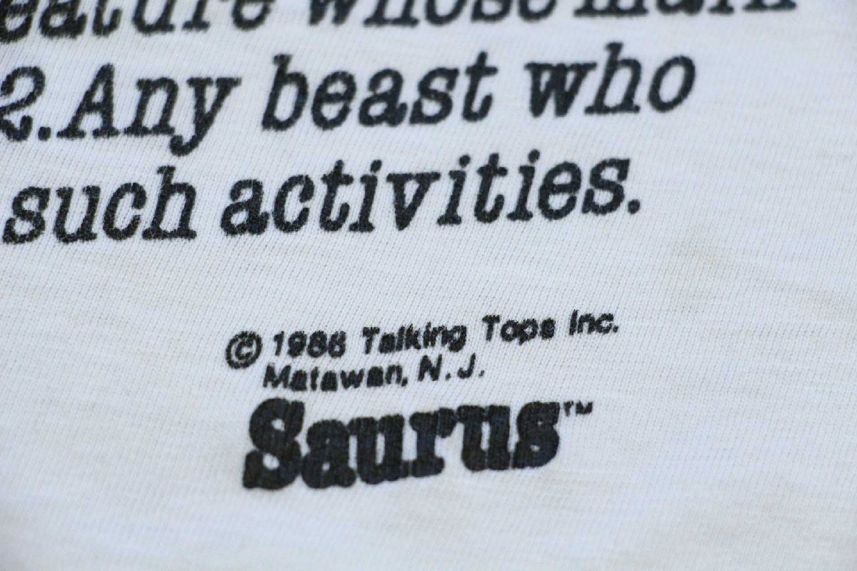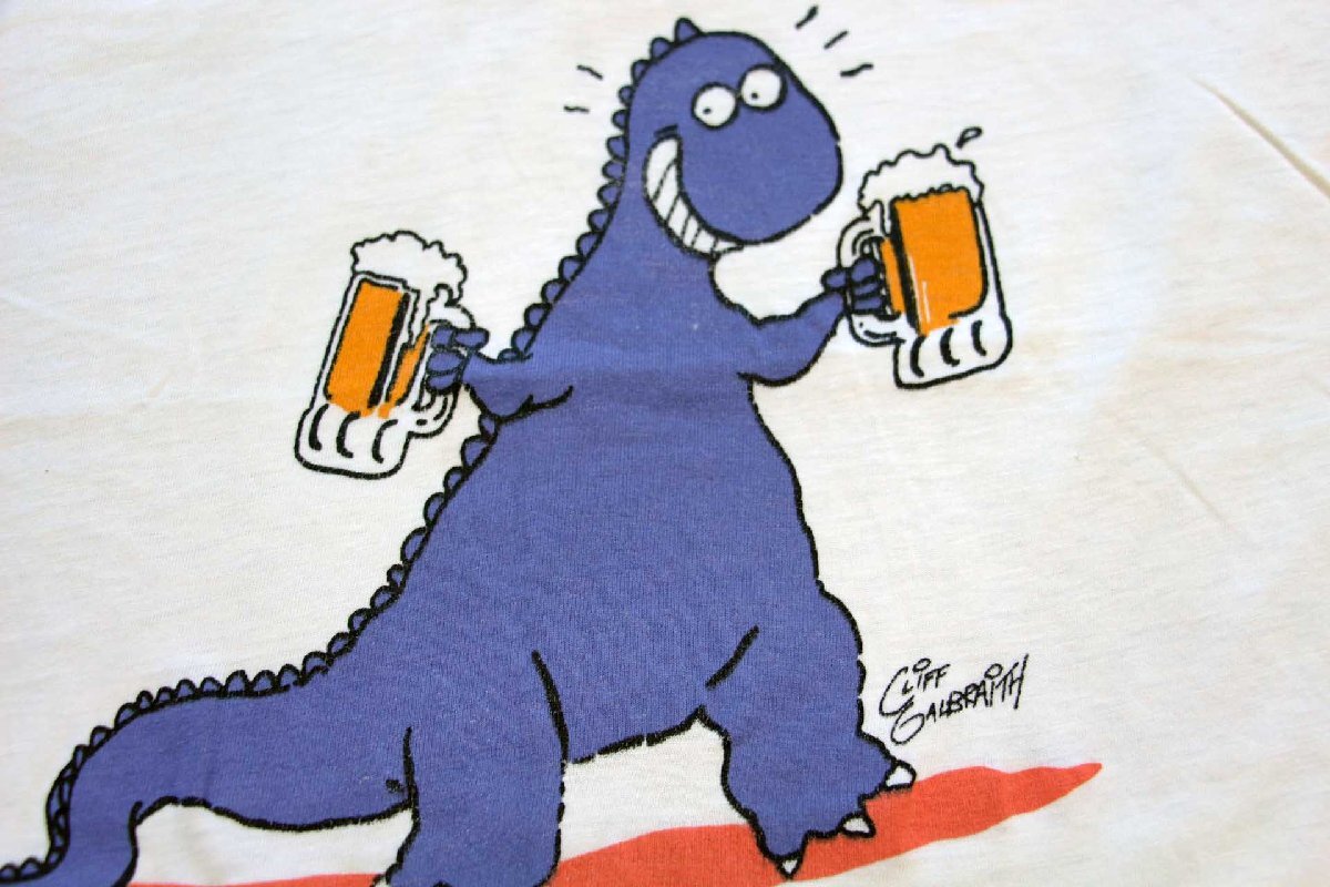 ★80s USA製 Saurusly Speaking Partyasaurus 恐竜 ビール Vネック コットンTシャツ 白★オールド ビンテージ ワンピース オーバーサイズ