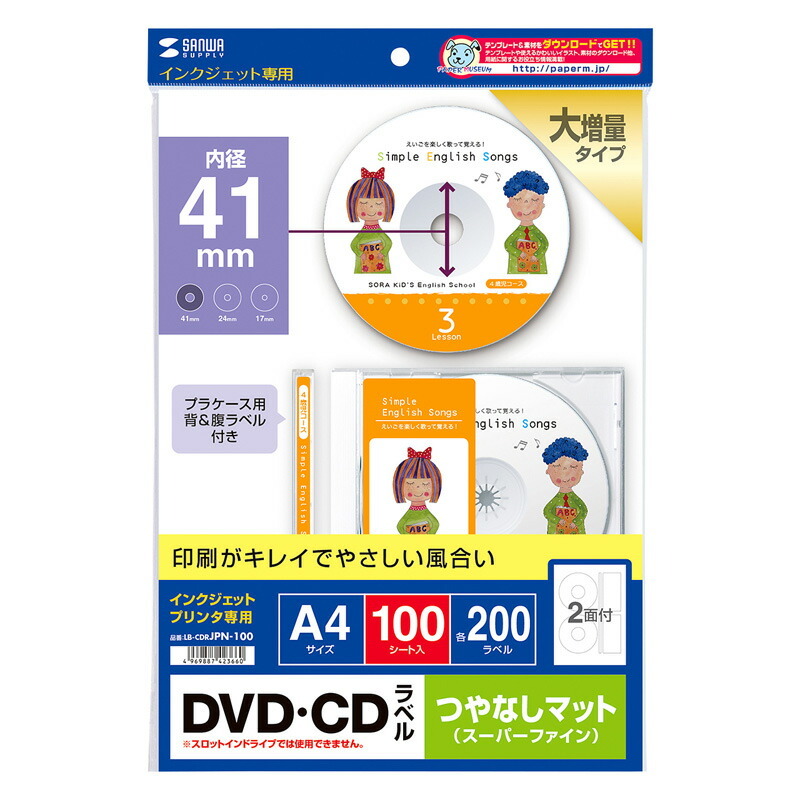 ●オリジナルのDVD・CDを美しく完成させるオリジナルラベルがインクジェットプリンターで手軽に作れます。標準サイズの内径41mmタイプです。