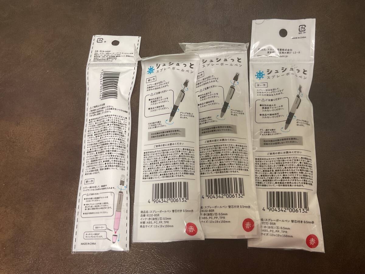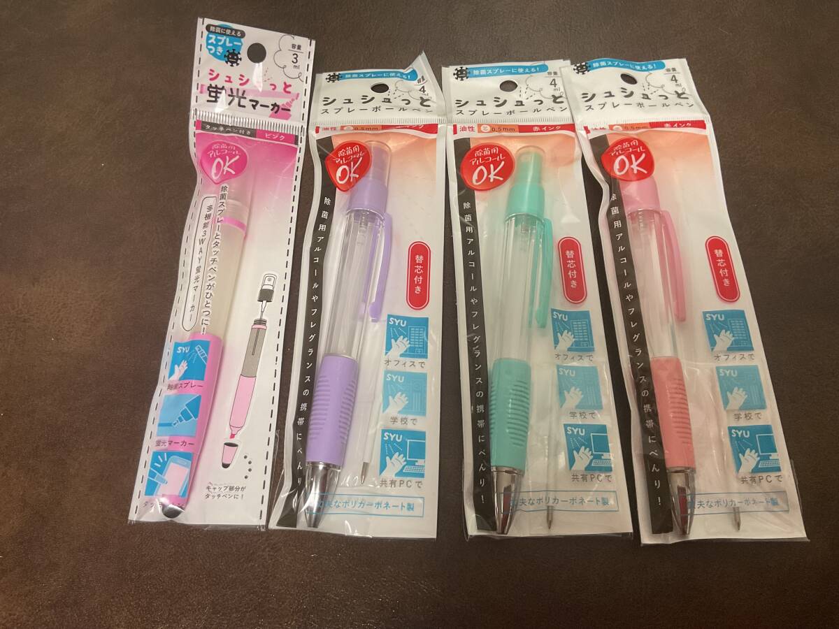 ⑦③新品★ ボールペン シュシュっとスプレー3色+シュシュっと蛍光マーカー 計4点セット 除菌スプレーや香水、水など入れれる